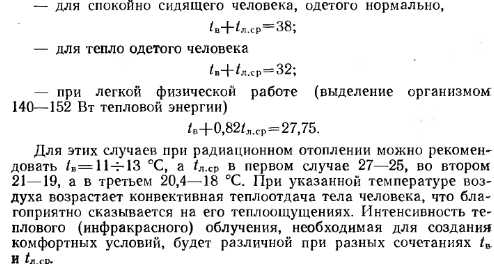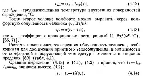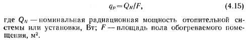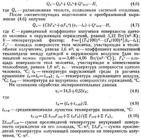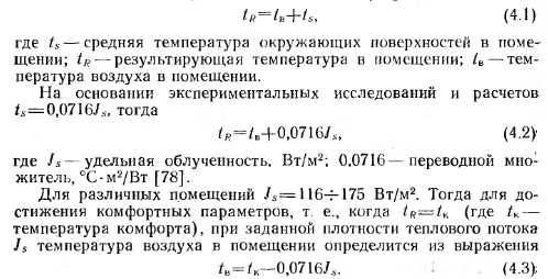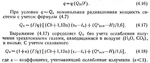 Анализ методов расчетаОдной из основных задач, которые необходимо решить при проектировании систем и установок лучистого отопления с ГИГ, является определение их установочной мощности. В отечественной и зарубежной практике проектирования существует несколько методов. Их можно разделить на две основные группы. Первая группа объединяет методы, основанные на определении тепловых потерь помещения с учетом комфортной или допустимой облученности. Вторая группа включает методы определения комфортной облученности обогреваемых людей или животных. При этом принимается, что доминирующим фактором комфорта является доза облученности. В работах [66, 68, 71] расчет отопительных систем и установок основан на определении их установочной мощности с учетом условий комфортного облучения по эмпирическим зависимостям или путем расчета лучисто-конвективного теплообмена человека. В работе [50] приведены данные по удельным тепловым нагрузкам в зависимости от назначения отапливаемого помещения и его конструктивных особенностей, по которым, зная площадь помещения, можно определить установочную мощность систем отопления. Использование методов, изложенных в вышеназванных работах, не дает полной картины о температурных параметрах отапливаемых помещений, так как эти методы не учитывают тепловых потерь помещения и кратность воздухообмена в нем. В литературе [23, 38, 43, 51, 72] рассмотрены методы расчета систем отопления газовыми излучателями с учетом тепловых потерь помещений и особенностей излучающих приборов. В силу сложности процессов теплообмена и массопереноса, протекающих при газовом радиационном отоплении, изложенные в этих работах методы не учитывают многих специфических вопросов высокотемпературного газового лучистого обогрева. Так, в работе [72] предлагается определять установочную мощность по тепловым потерям, рассчитанным по известным формулам конвективного отопления с учетом инфильтрации. Установочную мощность принимают на 25 % меньше определенной тепловой нагрузки. В работе [43] в основу расчета положен тепловой баланс помещения, без учета специфики радиационного теплообмена. В. В. Иванов предложил полуэмпирические формулы для расчета установочной мощности систем газового радиационного отопления с учетом особенностей радиационно-конвективного теплообмена [23]. Ж. В. Мирзоян [38] определяет установочную мощность при лучисто-конвективном теплообмене в помещении. Недостаток указанных методик заключается в том, что в одних [23, 43, 68, 71, 72] не принимаются во внимание особенности радиационного теплообмена системы обогрева с помещением (излучатели- ограждения), в других [38] не решается внутренняя задача — комфортная облученность. Так, западногерманская фирма «Шванк» при расчете установочной мощности исходит из эмпирической зависимости [66]: ![]() Французская фирма «Антаргаз» предлагает метод расчета установочной мощности системы на основании определения тепловых потерь с учетом инфильтрации по известным формулам, применяемым при расчете конвективного отопления. При этом установочная мощность системы лучистого отопления принимается на 25 % меньше, чем у системы конвективного отопления. При рассмотрении методов расчета установочной мощности систем отопления с ГИГ следует отметить, что они решают задачи обогрева всего отапливаем