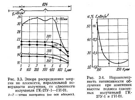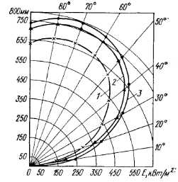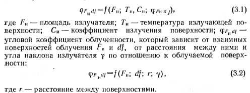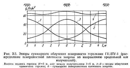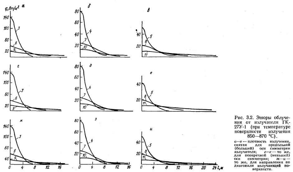 Эпюры облучения горелокПри проектировании и эксплуатации систем и установок с ГИГ помимо теплотехнических характеристик, присущих всем газовым горелкам (тепловая мощность, рабочее давление и расход газа), необходимо знать характер распределения энергетической освещенности (облученности) от излучателя, который зависит от температуры, линейных размеров и формы излучающей поверхности, а также от конструкции рефлектора. В проектной практике чаще всего необходимо иметь картину плоскостного распределения поверхностной плотности энергии от излучателя. Ее дают эпюры облучения ГИГ. В работах [34, 49, 54] описаны экспериментальные установки для определения эпюр облучения, приведены результаты исследования для излучателей ГИИ-3, Г14И-8. Одна из схем экспериментальной установки для определения эпюр облучения рассмотрена в разделе 2.2. В работе [34] описана методика экспериментального построения пространственных эпюр облученности, позволяющих определять поверхностную плотность энергии на различных расстояниях от горелки и под различным углом к ее поверхности, а также суммарную энергию, передаваемую непосредственно излучением. Исследуемый излучатель следует поместить в центре полусферы определенного достаточно большого радиуса (1—3 м). Плотность- излучения измеряют в заранее рассчитанных точках на поверхности четверти сферы (рис. 3.1). Определив количество теплоты Qлуч, воспринимаемое полусферой от излучающего насадка, и отнеся его к удельной тепловой нагрузке излучателя, можно определить лучистый КПД горелки. Так, для излучателя ГИ-01 он составил, %, при удельной тепловой нагрузке 127 кВт/м2 — 52,7; при 150 кВт/м2 — 53,5; при 160 кВт/м2 — 52. Эпюры облучения для излучателей ГК-27У-1 (ГИИ-19А) и. ГИИВ-1, полученные автором на основании экспериментальных исследований, приведены в работе [50]. Они показывают распределение поверхностной плотности энергии в плоскости пола обогреваемого помещения от горелки по трем направлениям (продольной, поперечной осям симметрии и по диагонали излучателя) в зависимости от высоты подвеса излучателя и его удельной тепловой нагрузки (рис. 3.2). По оси ординат откладывается поверхностная плотность энергии q, Вт/м2, по оси абсцисс — расстояние /, м, по горизонтали от центра излучателя. ![]() Цифры на кривых указывают высоту подвеса излучателя Н, м, над уровнем пола. По характеру распределения энергии излучения применяемые в терморадиационных установках нагрева и сушки излучатели, подвешенные на малой высоте (150—350 мм) отличаются от подвешенных на больших высотах (3—11 м). На рис. 3.3 приведена эпюра облучения по большей оси сдвоенною излучателя (блока горелок) ГК-27У-1 — ГИ-01, установленного параллельно облучаемой поверхности. Удельная тепловая нагрузка горелок 141 кВт/м2; температура керамики Гикер=1145 К, температура вторичного излучателя 7ис=1030 К- Излучающая поверхность состоит из керамических плиток с dorH = l,55 мм и сетки-экрана № 2—1,2 из стали марки 1Х18Н9Т. Анализ эпюр показывает, что под излучателем наблюдается неравномерность поверхностной плотности энергии (рис. 3.4). Однако следует заметить, что неравномерность эта обусловлена резким падением поверхностной плотности энергии в точках 6 и 7,. т. е. в 100 мм от края блока. При проектировании терморадиационных сушил и других установок снять эту неравномерность можно, расположив излучател