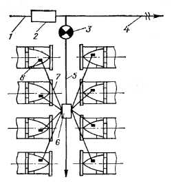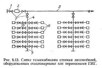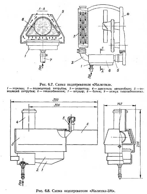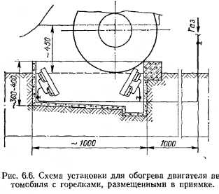 Использование горелок при безгаражном содержании автотракторного паркаГазовые инфракрасные горелки применяют в системах и установках обогрева людей (на открытых и частично закрытых площадках), а также двигателей и элементов трансмиссий автомобилей и тракторов. Совершенствование зимней эксплуатации автотракторного парка, облегчение запуска двигателей в условиях безгаражного содержания автомобилей и тракторов с достижением при этом наибольшего технико-экономического эффекта, который выражается в минимуме удельных затрат материальных ресурсов и времени на запуск, снижении пусковых износов двигателя, экономии топлива, улучшении охраны труда и условий работы шоферов и т. д., — задача огромного народнохозяйственного значения. Одно из эффективных решений этой задачи специалисты видят в широком распространении на автомобильном транспорте подогревателей и устройств различной конструкции, в которых в качестве источника тепла используются газовые горелки. В некоторых автохозяйствах Вильнюса и Минска применяют стационарные установки обогрева с горелками, размещенными в приямках, защищающих горелки от задувания. На рис. 6.6 показана схема установки для подогрева двигателя, картера и коробки передач, оборудованная газовыми горелками, работающими на природном газе. В приямке устанавливаются две горелки, розжиг которых осуществляют переносным запальником. В зависимости от вида автомобиля угол наклона горелок к плоскости картера можно менять, а в зависимости от температуры наружного воздуха можно включать одну или обе горелки. При неработающих горелках приямок закрывают металлическими створками, защищающими его и горелки от осадков. Горелки работают в межсменное время. Температура масла в картере поддерживается на уровне не ниже плюс 35—40 °С. Во время стоянки воду из радиатора не сливают. Время запуска двигателя составляет 1—2 мин. Опыт эксплуатации автомобилей при межсменном подогреве двигателей дал хорошие результаты и показал высокую эффективность применения стационарных установок с ГИГ в приямках. ![]() Другим эффективным способом межсменного подогрева является применение на автомобильном транспорте подогревателей «Малютка», широко используемых в ряде автохозяйств Москвы (автобазы № 4 и 39 Мосстройтранса, автокомбинаты № 15, 16, 37 и др.). Подогреватель «Малютка» разработан проектно-конструкторским бюро (ПКБ) Главмосавтотранса. Создано семейство подогревателей для автомобилей ГАЗ-53, ЗИЛ-164, ЗИЛ-130, МАЗ-200, МАЗ-500, КрАЗ-219 и «Шкода»-706РТ. Конструкция подогревателя несложна, он сравнительно мал по размерам и массе, прост в изготовлении и монтаже. Схема теплообменника и установки его на двигателе автомобиля показана на рис. 6.7. Газ через штуцер 7 поступает в горелку 1, излучающая поверхность которой отдает генерируемую ею теплоту бачку 8 теплообменника 6 с наружным кожухом 9. Вода из радиатора 3 по подводящему патрубку 2 через теплообменник 6, нагреваясь, по отводящему патрубку 5 поступает в двигатель 4. ![]() На рис. 6.8 представлен подогреватель «Малютка-ЗМ», предназначенный для автомобиля МАЗ-200. Газ поступает по штуцеру в горелку 2, снабженную ветрозащитным устройством 1. Посредством подводящего патрубка 4 и отводящего патрубка 6 теплообменник включен в систему охлаждения двигателя. Продукты сгорания от горелки отводятся п