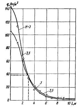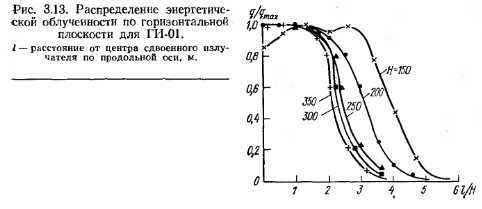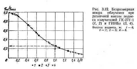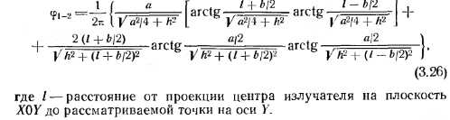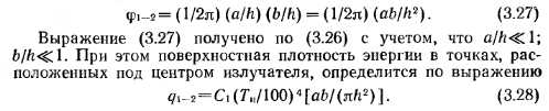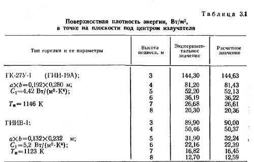 Лучистые характеристики горелокРадиационное взаимодействие излучателя с любой поверхностью, как уже указывалось, в общем случае можно рассматривать как взаимодействие между серыми телами, произвольно расположенными в пространстве. На основании закона Стефана—Больцмана, зависимостей, приведенных в разделе 1.3, лучистый теплообмен между ними можно выразить формулой ![]() Степень черноты излучающей поверхности горелки, поверхностей ограждений, поверхности одетого человека — это величины одного порядка. Можно считать, что ei = 82~ « 0,85 — 0,9, следовательно, Л1 = Л2. Температура излучающей поверхности значительно выше, чем облучаемой (особенно в системах отопления зданий и при зонном обогреве), отсюда значением Т2 можно пренебречь. При выводе формулы углового коэффициента (3.17) принято. На основании свойства взаимности запишем С учетом вышеизложенного поверхностная плотность энергии (интенсивность облучения) может быть получена из выражения (3.24) в виде ![]() По формуле (3.25) с учетом выражения (3.17) можно построить эпюры облучения от прямоугольного излучателя с любым соотношением сторон а/b, при любом угле наклона его относительно облучаемой поверхности и заданной высоте подвеса. Сравним эпюру облучения, полученную экспериментально, с теоретически рассчитанной по формуле (3.25). Экспериментальные эпюры облучения построены для излучателей, расположенных параллельно плоскости пола [49]. Для такой схемы расположения излучателя формула (3.17) значительно упростится при условии и примет вид ![]() ![]() ![]() Формула (3.26) выведена для условия, когда сторона b излучателя имеет положительное значение и направление по оси Y. Если необходимо определить угловой коэффициент облученности при расположении стороны а излучателя по оси Y, то в формуле (3.26) необходимо поменять местами а и Ь. Из графиков (рис. 3.11) видно, что все экспериментальные значения поверхностной плотности энергии легли на теоретические кривые эпюр облучения, построенные по выражению (3.25) с учетом формулы (3.26), относительная погрешность не превышает 2%. Значение коэффициента облученности для системы «элементарная площадка под центром излучателя», излучающая поверхность которого параллельна плоскости пола, определится по асимптотической формуле ![]() В табл. 3.1 приведены значения поверхностной плотности энергии для данного случая расположения излучателя и элементарной площадки, полученные экспериментальным и расчетным путями. Из табл. 3.1 видно, что теоретически полученные по формуле (3.28) значения 7I-2 практически совпадают с экспериментальными данными. Расчеты, связанные с определением и графическим выражением лучистых характеристик ГИГ, можно значительно упростить, если элюру излучения построить в безразмерных координатах. Анализ эпюр облучения показал, что параметрический ряд ГИГ, а также горелки, имеющие сопоставимые геометрические и температурные параметры, имеют одну безразмерную эпюру облучения. ![]() ![]() Так как в серийном и экспериментальном производстве применяют излучатели с различным излучающим насадком, ниже приведены результаты исследований по определению энергетической облученности для горелок с одинаковой по геометрическим размерам поверхностью излучения, но с разными излучающими насадками (табл. 3.2) при изменении удельной тепловой нагрузки и расстояния до облучаемо