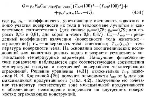 Особенности расчета газового лучистого отопления животноводческих помещенийВ нашей стране ГИГ широко применяют для обеспечения параметров микроклимата в животноводческих и птицеводческих помещениях. Различными организациями (ВНИИГаз, ГипроНИИГаз, УкрНИИгипросельхоз и др.) разработаны временные указания и рекомендации по проектированию, монтажу и эксплуатации систем и установок лучистого обогрева. В связи со сложностью теплотехнических расчетов и нормирования параметров микроклимата при применении ГИГ в этих рекомендациях есть обоснованные и волевые допущения, что обусловлено недостаточностью теоретических и экспериментальных исследований в данной области. В рекомендациях по выбору оптимальных режима работы систем обогрева и интенсивности облучения животных различного вида и возраста имеются значительные расхождения. Теплообмен между животным, окружающим воздухом и ограждениями зависит от работы системы терморегуляции животного, определяется совокупностью конвективного и лучистого теплообмена, расходом теплоты на испарение влаги с поверхности их кожи и теплопроводностью. Тепловые потери животного в значительной степени зависят от его мышечной активности и положения тела. Стоя, животные расходуют энергии больше, чем лежа. Так, если животное стоит, вся поверхность его тела участвует в конвективном теплообмене и только 90%—-в лучистом. Если животное лежит, то в конвективном теплообмене участвует 75 % поверхности его тела, а в лучистом — 70. На лучистый теплообмен животных значительное влияние оказывает соотношение частей его тела, участвующих в теплообмене как взаимном, так и с внутренними поверхностями ограждений. Например, угловой коэффициент лучистого теплообмена животных с ограждениями фж—ЕОгр=0,93-f-0,95 в широкогабаритных помещениях и 0,76 в коровниках. Уравнение лучистого — конвективного теплообмена на поверхности тела животных, учитывающее активность их поведения в течение суток и долю участия их поверхности в теплообмене с ограждениями, имеет вид: ![]() Так как в свинарниках-маточниках и родильных отделениях коровников взрослые животные содержатся совместно с молодняком, то для поддержания температурных условий, обеспечивающих зону максимальной продуктивности взрослых животных, необходим дополнительный обогрев молодняка. Для этой цели применяют установки локального обогрева с ГИГ. Исследования показали, что абсолютная интенсивность облучения при местном обогреве в свинарниках-маточниках может быть различной, она определяет уровень снижения температуры воздуха и ограждающих конструкций. Постоянным должно быть изменение интенсивности облучения от максимальной до минимальной, Вт/м2: на площадках молодняка 93—115, в целом по станку 140—160. Максимальная интенсивность облучения должна поддерживаться на небольшой части площадки молодняка, занимаемой новорожденными поросятами. Колебания ее возможны в пределах 160—280 Вт/м2, что обеспечивает технологический цикл выращивания молодняка и благоприятные условия для работы обслуживающего персонала. ![]() В работе [63] автор подошел комплексно к рассмотрению вопросов, связанных с созданием необходимых параметров микроклимата при отоплении животноводческих помещений ГИГ. Решается задача проектирования ограждающих конструкций с учетом особенностей т