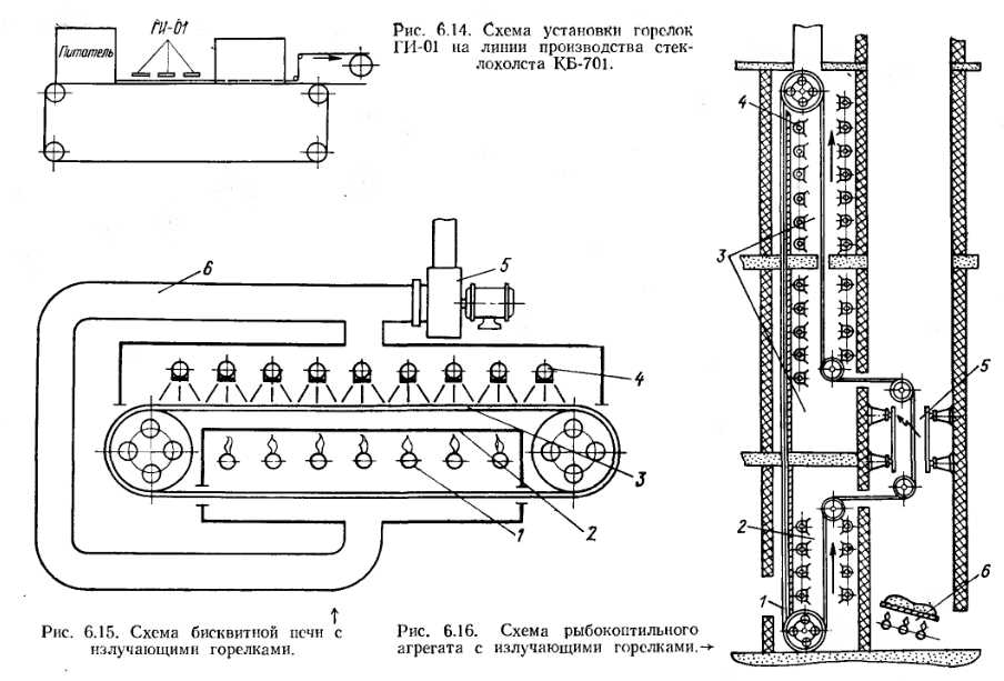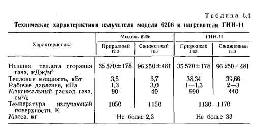 Применение газовых излучающих горелок в технологических установкахНизко- и среднетемпературный радиационный обогрев эффективнее конвективного, и все шире применяется в различных технологических установках и устройствах. Применение ГИГ позволяет заменить электрические излучатели и наиболее эффективно использовать газообразное топливо. В литературе [6, 10] описаны различные технологические установки с ГИГ. Ниже рассмотрим те из них которые, на наш взгляд, недостаточно освещены, а область применения их весьма эффективна и требует более пристального внимания специалистов теплотехников и технологов. Широк диапазон применения ГИГ при выполнении строительных работ в зимнее время: для радиационной сушки штукатурки и прогрева кладки в строительных объектах; для просушки больших окрашенных поверхностей и прогрева конструкций перед нанесением гидроизоляции; при выполнении кровельных работ рулонными материалами; для прогрева бетона и нагрева стыковых соединений сборных железобетонных конструкций или их омоноличивания. Сроки проведения работ сокращаются при этом в 2— 3 раза по сравнению с другими методами тепловой обработки. Строительство магистральных газопроводов из труб большого диаметра и повышение рабочего давления в них привели к увеличению толщины стенок трубопроводов и применению новых марок специальных сталей. Это в свою очередь обусловило изменения технологических процессов сварки, повышающих качество и надежность сварных соединений, направленных на улучшение структуры и стабилизации механических и физических свойств металла, снижения уровня остаточных напряжений в области стыка, что достигается термической обработкой зоны сварных соединений. Наиболее простой из применяемых методов — газопламенный — с использованием подогревателя стыков ПС-1424, который состоит из газогорелочного устройства с инжекционными горелками и емкостью для хранения и регазификации углеводородных газов. Однако для сварки толстостенных труб и изделий, особенно в заводских условиях, предпочтителен газовый радиационный нагрев с использованием ГИГ. ВНИИпромгазом совместно с НПО «ЦНИИТмаш» разработан газовый инфракрасный нагреватель (ГИН) труб с использованием унифицированных ГИГ модели 6206, который может быть использован для нагрева заготовок любой конфигурации, так как его конструкция, выполненная по принципу браслета, повторяет форму заготовки. Унифицированная секция с ГИГ позволяет наращивать браслет до требуемых размеров заготовки. Нагреватель с помощью растяжного устройства (опорных винтов) закрепляется на заготовке. Температура заготовки регулируется за счет изменения расстояния от поверхности излучателя до нее. Ширина кольцевого нагрева однорядного браслета составляет 250, а двухрядного 500 мм. Для трубы диаметром 450 мм необходимо 11 секций с ГИГ. В табл. 6.4 приведены данные по нагревателю ГИН-11 и излучателю 6206. Опыт эксплуатации показал, что для нагрева заготовки диаметром 450 мм, толщиной 50 мм до 200—300 °С на кольцевом участке шириной 250 мм необходимо 20—30 мин (при температуре воздуха в цехе 18—19 °С и подвижности его 0,3—0,5 м/с). Годовой экономический эффект от применения одной установки по сравнению с электронагревом составляет более 2 тыс. руб. Качественное строительство и ремонт асфальтобетонных дорожных покрыти