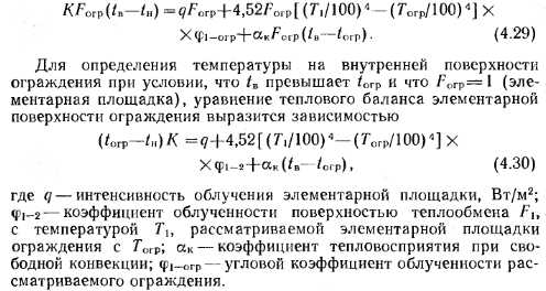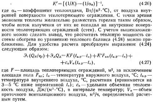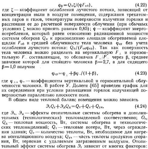 Расчет систем газового лучистого отопления производственных помещенийПри определении установочной мощности и проектировании систем обогрева помещений ГИГ появляется необходимость решить задачи, которые не возникают при проектировании конвективного, панельно-лучистого отопления, связанные с особенностями теплообмена как помещения с системой обогрева, так и человека с помещением и с системой обогрева. Вопросы теплообмена при панельно-лучистом отоплении достаточно подробно рассмотрены в работах В. И. Богословского [7, 8], А. Мачкаши {37], А. Миссена- ра {39]. Что же касается систем газового лучистого обогрева, то вопросы тепло- и массообмена не получали должного рассмотрения и комплексного решения в силу сложности протекаемых при этом процессов и удовлетворительного эффекта работы систем обогрева, рассчитанного на основании данных и методов, приведенных в разделе 4.1. Системы газового лучистого отопления с ГИГ отличаются от всех других отопительных систем особенностями применяемых в них отопительных приборов. Излучающие горелки имеют относительно малую поверхность излучения. Так, серийно выпускаемая горелка ГИИВ-2, поверхность излучения которой состоит из 20 плиток, имеет площадь излучающего насадка «0,06 м2. В практике проектирования в эксплуатации лучистых систем отопления с ГИГ редко приходится применять горелки, площадь излучающего насадка которых превышала бы приведенную для ГИИВ-2. Температура же излучающей поверхности находится в пределах 800— 900 °С. Характер теплообмена в системе ГИГ — ограждающие конструкции н тепловые потери помещения будут изменяться при различном расположении горелок в отапливаемом помещении и существенно зависеть от организации воздухообмена. Комфортные условия в помещении в большей степени зависят от количества теплоты, получаемой непосредственно человеком, в меньшей степени от температуры внутренних поверхностей ограждений и воздуха в помещении. Указанные выше факторы необходимо учитывать при расчете тепловой мощности системы. При расчете систем газового лучистого отопления необходимо определять тепловые потери отапливаемого помещения, температуры воздуха и внутренних поверхностей ограждающих конструкций, состав воздушной среды, число и характеристики горелок. Кроме того, следует выявить характер распределения лучистой энергии в обогреваемом помещении, создать требуемое равномерное распределение тепловых потоков по площади пола и определить соответствие системы обогрева гигиеническим требованиям. В. Н. Богословский предложил систему балансовых уравнений, с помощью которых описал процесс тепло- и массообмена, протекающий в отапливаемом помещении [7, 8]. Число этих уравнений зависит от условий постановки задачи. Теплофизический расчет здания методом балансовых уравнений нашел развитие в работе [4]. Использовав накопленный опыт расчета и проектирования систем лучистого отопления с применением ГИГ и теоретические предпосылки [7, 8, 65], рассмотрим, как определяется мощность систем лучистого обогрева. При расчете установочной мощности системы необходимо учитывать комфортную и фактическую интенсивность облученности человека, а также тепловой баланс помещения. Так, А. Е. Ковалев, рассчитавший необходимый тепловой поток для поддержания оптимального, комфортного, состояния