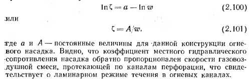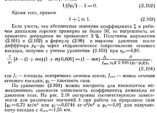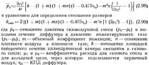 Расчет инжекционных смесителей излучающих горелок с учетом гидравлического сопротивления насадкаГазовые излучающие горелки используют в основном при низ- жом давлении газа перед соплом. Коэффициент избытка первичного воздуха при сжигании газа в них, как указывалось выше, составляет «=1,05, это значит, что при работе на природном газе необходимо подсасывать 10-кратный, а при работе на сжиженном газе 26-кратный объем воздуха. При этом коэффициент инжекции должен оставаться в допустимых пределах даже при значительных колебаниях давления газа в сети, так как горелка должна работать без химического недожога. Обеспечение стехиометрического состава газовоздушной смеси — одна из главных задач при проектировании ГИГ. Эта задача выполнима при соответствующем расчете инжекционного смесителя. В литературе описано большое число методов и приведено множество формул для расчета инжекционных смесителей [1, 24, 25, 33, 59, 61]. Предлагаемые различными авторами формулы (при всем их многообразии и различии) можно разделить на две группы. К первой относятся формулы, позволяющие определить такие размеры инжекционного смесителя при заданном гидравлическом сопротивлении на выходе из него, которые обеспечивают необходимый коэффициент инжекции при определенном давлении газа; ко второй — позволяющие определить размеры инжекционного смесителя, обеспечивающие получение максимального коэффициента инжекции при заданном относительном противодавлении или же преодоление максимально возможного противодавления при заданном коэффициенте инжекции. Такой метод расчета называется расчетом по оптимальным соотношениям. Формулы второй группы позволяют рассчитывать инжектор даже тогда, когда гидравлические сопротивления за ним неизвестны. При этом, если действительное гидравлическое сопротивление на выходе окажется меньше предельно допустимого, то рассчитанный инжектор будет обеспечивать больший, чем требуется для горения, коэффициент инжекции; это приводит к необходимости принимать дополнительные конструктивные меры для снижения коэффициента инжекции. Кроме того, размеры инжектора при этом оказываются завышенными по сравнению с полученными по формулам первой группы. Воспользуемся основным уравнением для расчета смесителей при учете гидравлических сопротивлений на выходе из инжектора, приведенным в работе [33]: ![]() При проектировании горелок ГИИ-1, ГИИ-3, ГИИ-8 и .других, разработанных ГипроНИИГазом, инжекторы газовых смесителей рассчитывались по оптимальным соотношениям, так как не были известны гидравлические потери в излучающих насадках и, следовательно, соответствующие им коэффициенты гидравлических сопротивлений. По формуле (2.99) были определены оптимальные соотношения площадей поперечного сечения цилиндрической камеры смешения и газового сопла для природного и сжиженного газов; при т = 10 &ОПт=198, а при т = 26 &Опт = 405. Как и следовало ожидать, коэффициент инжекции и размеры указанных выше горелок оказались несколько завышенными. При полностью открытом регуляторе первичного воздуха коэффициент инжекции при работе на природном газе составил т=13. Подсос воздуха приходилось уменьшать, создавая с помощью воздушной заслонки дополнительное местное сопротивление на входе воздуха в инжектор. Кроме того, не удалось обеспечить унификацию инж