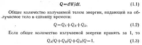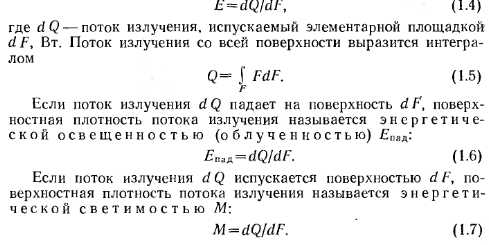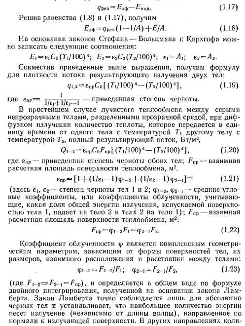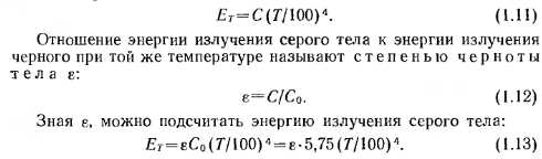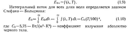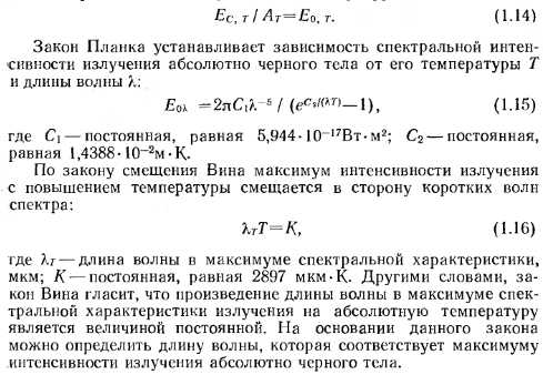 Законы и особенности лучистого теплообменаДля того чтобы понять сущность лучистого теплообмена, действие лучистых отопительных устройств и систем, необходимо знание основных физических законов инфракрасного излучения. Лучистый теплообмен представляет собой теплообмен между телами с разной температурой поверхности посредством инфракрасного излучения, т. е. электромагнитного излучения, занимающего область спектра электромагнитных волн от 0,77 до 340 мкм (диапазон волн дан в соответствии с рекомендациями Комитета технической терминологии АН СССР). При этом диапазон 340—100 мкм считается длинноволновым, 100—15 мкм — средневолновым, а 15—0,77 мкм — коротковолновым. Коротковолновая часть инфракрасного спектра примыкает к видимому свету, а длинноволновая сливается с областью ультракоротких радиоволн. В связи с этим инфракрасное излучение распространяется прямолинейно, преломляется, отражается и поляризуется, так же как видимый свет. В то же время, подобно радиоволнам, оно может проходить сквозь некоторые материалы, непрозрачные для видимого излучения. Любое тело, имеющее температуру выше абсолютного нуля, излучает тепловую энергию в инфракрасном диапазоне спектра электромагнитных волн. Различные тела при одной и той же температуре обладают различной лучеиспускательной способностью, которая зависит от природы и строения тел, а также от формы и состояния их поверхности. Электромагнитное излучение имеет двойственную корпускулярно-волновую природу. Электромагнитное поле обладает квантовым характером. Квантами его являются фотоны. При взаимодействии с веществом фотон поглощается его атомами, передает свою энергию электрону, а сам исчезает. При этом возрастает энергия тепловых колебаний атомов в молекулах вещества, т. е. энергия излучения переходит в теплоту. Перенос энергии происходит от тела с более высокой температурой к телу с меньшей температурой. Основной величиной является энергия излучения W, измеряемая в джоулях (Дж). Потоком излучения называют среднюю мощность излучения за время, значительно превышающее период колебания (энергия излучения за единицу времени). Единица потока излучения — джоуль на секунду (Дж/с) или общепринятое— ватт (Вт). ![]() ![]() Для каждого из участвующих в лучистом теплообмене тел существует несколько потоков излучения: поток собственного излучения Е, зависящий от температуры Т и оптических свойств тел; поток падающего излучения ?пад; потоки поглощенного, отраженного и пропускаемого излучения, сумма которых равна Епад. В общем случае среда, разделяющая тела, может поглощать излучение и вносить поток собственного излучения. При лучистом теплообмене между несколькими телами каждое тело характеризуется потоком эффективного излучения: ![]() Тело, для которого при любой температуре Л= 1, R = 0 и 0=0, называется «абсолютно черным». Существует понятие «черное излучение». Этот вид излучения соответствует температурному равновесию тела, и количество испускаемой энергии излучения определяется только температурой тела и не зависит от его природы. Этому понятию и отвечает абсолютно черное тело, которое способно поглощать всю падающую на него энергию излучения. Поток собственного монохроматического излучения Е0>. абсолютно черного тела для заданной длины волны % и температуры Т определяется законом Пл