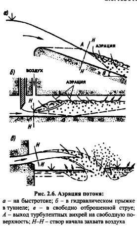 АЭРАЦИЯПри проектировании сооружений, пропускающих поток с большими скоростями, решается ряд вопросов, связанных с аэрацией потока, т.е. с захватом водой воздуха. Захват воздуха потоком происходит через свободную поверхность воды при ее разрушении турбулентными вихрями, поверхностными водоворотами, возникающими, например, при истечении воды изпод затвора, в гидравлическом прыжке, а также свободными струями (рис. 2.6). Захват воздуха через свободную поверхность потока называют самоаэрацией.