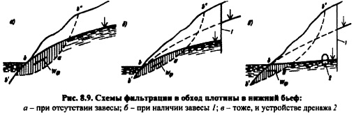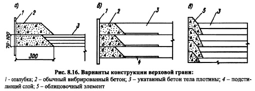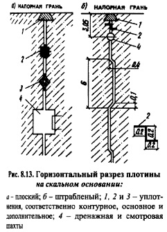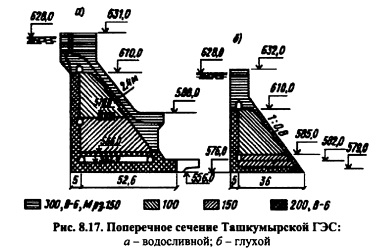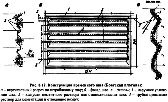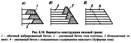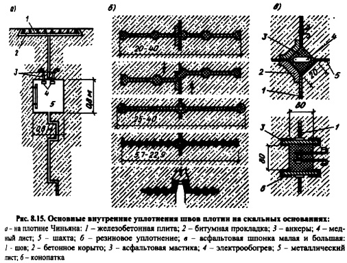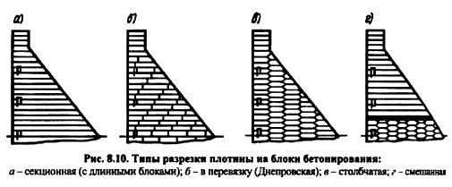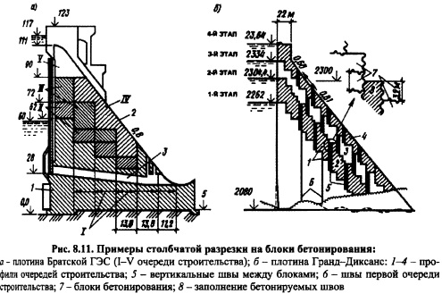 КОНСТРУКЦИИ ПЛОТИН И ИХ ЭЛЕМЕНТОВСовременные гравитационные плотины строят обычно водосбросными, т.е. с водосливными или глубинными отверстиями; глухими выполняют лишь участки, сопрягающие водосбросную плотину с берегами или со станционной частью плотины, в которой располагаются водоводы для ГЭС. Полностью глухие бетонные плотины строят редко, так как они менее экономичны, чем плотины из грунтовых материалов. Хотя один из вариантов Эвенкийской ГЭС (Турухан ской предусматривает строительство бетонной плотины длиной по створу 2400 м из них водосливы расположены только в русловой части (450 м). Расположение плотины в плане. Обычно ось плотины прямолинейна (см. рис. 8.2, а и 8.3, а), хотя бывает и криволинейной (или ломаной). Прямолинейная плотина требует обычно минимальной затраты материала и поэтому предпочтительнее. Криволинейная форма плотины в плане применяется в случаях неоднородности геологических условий в основании и необходимости размещения пло тины в плане на выходах более надежных пачек пород, а также когда в соответствии с топографическими условиями створа на разных участках по высоте для достижения минимума объема сооружения необходимо искривлять плотину в плане. Раньше, когда принимались меньшие удельные расходы, криволинейные в плане плотины применялись для получения заданной длины водослива при недостаточной ширине створа (например, Днепровская плотина); в современных условиях это не явилось бы удачным решением. Кроме того, на очертание оси плотины может влиять общая компоновка сооружений в гидроузле (см. гл. 24). Профили плотины. Конструкция глухих плотин наиболее проста: профиль их представляет собой треугольник, откорректированный в соответствии с условиями работы сооружения (см. п. 6.2). Даже для самых высоких напоров этот профиль остается наилучшим. Так, профиль наиболее высокой гравитационной плотины ГрандДиксанс (см. рис. 8.11, б) имеет вертикальную напорную грань и в нижней части на высоте 120 м некоторое отклонение от вертикали с наклоном т = 0,03 (с заложением 3,2 м); низовая грань плотины имеет переменный наклон: вверху 0,68, в средней и нижней частях 0,81. Некоторое нависание напорной грани плотины в сторону верхнего бьефа обеспечивает сжимающие напряжения на напорной грани, при этом максимальные сжимающие напряжения на низовой грани составляют 13 МПа. Профиль станционных частей плотины, которые строятся в комплексе со зданием гидроэлектростанции, располагаемом непосредственно за плотиной в нижнем бьефе (см. рис. 8.3, г) или с машинным залом гидроэлектростанции внутри плотины, аналогичен профилю глухой части плотины. Профиль водосливных плотин также вписывается в исходный треугольник (см. п. 6.2) с некоторыми отклонениями на гребне водослива и возможным устройством носка для сопряжения сбрасываемого потока с нижним бьефом (см. рис. 8.2, в). Зонирование бетона в теле плотины производят исходя из тех требований, которые предъявляются к бетону в отдельных зонах плотины. Подробно этот вопрос см. в п. 6.7. Границы зон на профиле плотины увязывают со схемой разрезки тела плотины на блоки бетонирования. Разрезка плоты на блоки бетонирования. Исходя из производственных условий, плотину возводят обычно путем укладки бетона в отдельные блоки. Схема разрезки сооружения на блоки и их размеры существенно влияют на характер раз