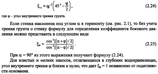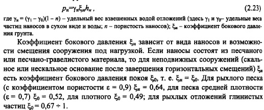 Сила давления наносов, рассчитанная по эпюре бокового давления покоя, намного больше силы активного давления, которое возникает, когда вследствие податливости основания (нескальное основание) возможно смещение сооружения. В этом случае при отсутствии трения грунта по вертикальной стене по Кулону: