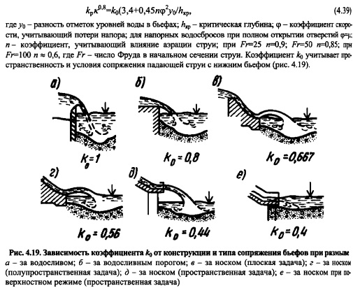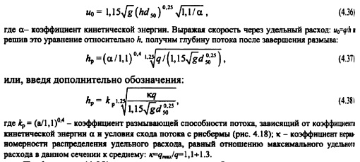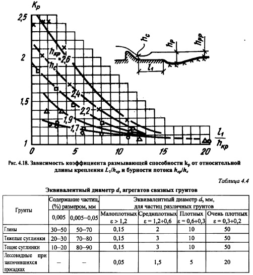 ДЕФОРМАЦИИ РУСЛА ПРИ ГИДРОТЕХНИЧЕСКОМ СТРОИТЕЛЬСТВЕГидроузел вносит существенное изменение в режим течения воды в реке на участках до и после сооружений. В водохранилище по мере уменьшения скорости течения воды с ростом глубины транспортируемые потоком наносы начинают выпадать (осаждаться) на дне, раскладываясь на убывающие по крупности фракции в направлении гидроузла. Этот процесс называется аккумуляцией наносов (твердого стока) в верхнем бьефе (более подробнее об этом см. гл. 25). Стеснение речного потока в плане у водопропускных сооружений, увеличенные в сравнении с бытовыми, пропускаемые через гидроузел удельные расходы воды, осветление (освобождение от наносов) воды в водохранилище значительно повышают размывающую способность поступающего в нижний бьеф потока, интенсифицируют русловые процессы, ведут к переформированию русла. Различают два основных вида переформирования (трансформации) русла в нижнем бьефе: общие и местные размывы. Общими размывами (трансформациями) называют изменения очертания дна и берегов реки на участках значительной протяженности; они ведут к изменениям уровневого режима, что проявляется в нарушении естественной бытовой связи расходов и уровней воды (УВ) в реке. Под местными размывами подразумевают изменения очертания русла на участках, примыкающих к креплению нижнего бьефа и влияющих на условия эксплуатации как крепления, ш и сооружения в целом. Расчет переформирования (трансформации) русел рек в нижнем бьефе гидроузлов включает: прогноз понижения уровней воды вследствие общего размыва; определение параметров ямы (воронки) местного размыва; расчет планового расширения потока и уточнение на его основе результатов расчета местного размыва. Физика процесса размыва. Твердые частицы грунта, расположенные на дне русла, подвержены действию следующих сил: тяжести G, взвешивания А, лобовой F, подъемной Т и пульсационной Т, вызванной турбулентностью движущейся воды. На лобовой части поверхности частицы, подверженной воздействию набегающего потока, возникает избыточное гидродинамическое давление, а на тыльной части поверхности наблюдается понижение давления вследствие отрыва потока от поверхности частицы и образования зоны отрыва. Горизонтальная составляющая равнодействующей гидродинамического давления по всей поверхности частицы представляет собой лобовую силу, величину которой определяют по известной формуле (2.6). Вертикальная составляющая равнодействующей гидродинамического давления является подъемной силой, которая вычисляется по аналогичной формуле ![]() По исследованиям A.M. Дементьева [99], отношение подъемной силы к лобовой изменяется от 0,35 до 0,7 в зависимости от формы частицы и ее расположения по отношению к набегающему потоку. Росту подъемной силы способствует несимметричное обтекание потоком частиц, лежащих на дне. При увеличении скорости потока (в паводок, при работе водопропускных сооружений) начинают расти лобовая и подъемная силы на наиболее выступающие над дном частицы, что приводит сначала к вибрации, а затем к их перекатыванию и переносу в виде скачков под действием проходящих турбулентных вихрей. Скорость, при достижении которой отмечается начало процесса движения частиц, называют неразмывающей скоростью и обозначают щ. При дальнейшем возрастании скорости п