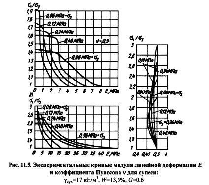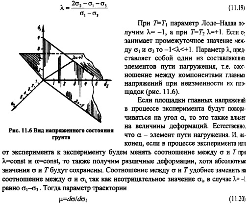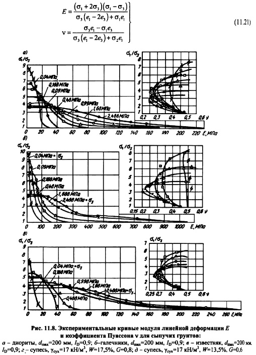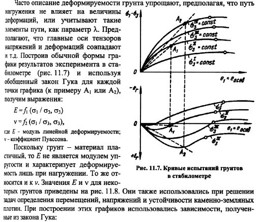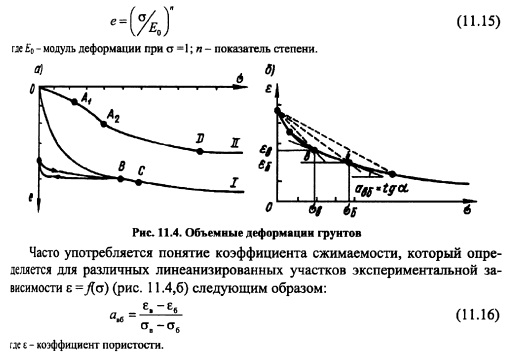 ДЕФОРМИРУЕМОСТЬ ГРУНТОВДеформируемость глинистых грунтов обусловлена главным образом взаимным перемещением твердых частиц грунта. В крупнозернистых грунтах главными факторами деформируемости являются смятие контактов и разрушение твердых частиц под нагрузкой. В песчаных грунтах происходят как процессы переориентирования и взаимного движения частиц, так и их разрушения. Деформации разделяют на объемные и формоизменения. Объемная сжимаемость глинистых двухфазных грунтов возможна лишь при отжатии воды из грунта. Поскольку поры грунта малы, то отжатие свободной воды происходит медленно, и процесс деформирования грунта в зависимости от его объема растягивается часто на длительный промежуток времени. Повышенная вязкость связной воды также замедляет процесс деформирования (объемного и формоизменения). Процесс деформирования глинистого грунта во времени описывается теорией консолидации грунтов, некоторые упрощенные положения которой изложены в 12.3. В песчаных грунтах процессы деформирования под действием статической нагрузки протекают быстро, поэтому обычно их во времени не рассматривают. В крупнозернистых грунтах процессы смятия контактов, их разрушение, перекомпоновка структуры вследствие разрушения отдельных зерен и перераспределение нагрузки между частицами часто так же, как и в глинистых грунтах, занимают длительное время, хотя механизм процесса во времени иной. Несмотря на то, что процесс деформируемости грунта длительный, основные деформации (до 90% и более) обычно протекают за сравнительно короткий промежуток времени после приложения нагрузки, поэтому при изучении деформируемости часто ограничиваются именно этими (скоротечными) деформациями. В глинистых грунтах это свойство ярко проявляется, когда коэффициент водонасыщения G=0,8-0,85 (см. формулу (7.10)) и деформации протекают в основном за счет газообразной фазы. В экспериментах устанавливается критерий стабилизации деформирования (некоторая малая скорость деформации), при достижении которого деформация условно считается затухшей. Несмотря на то, что грунт дискретное тело, для описания его свойств можно использовать математический аппарат механики сплошной среды. Критерий использования этого аппарата был установлен Н.М. Герсевановым. Обычно все грунты в плотиностроении отвечают этому критерию. Из механики сплошной среды известно, что тензор напряжений можно разделить на два тензора шаровой и девиатор, что в тензорной форме будет иметь вид: ![]() Если связь между напряжениями и деформациями линейна, то шаровой тензор напряжений вызывает только объемные деформации, а девиатор только изменение формы. В случае нелинейных связей появляются так называемые вторичные эффекты влияние девиатора напряжений (деформации) на объемное деформирование (шаровой тензор напряжений). Этот эффект часто приводит к дополнительному расширению или уплотнению грунта при сдвиге. В литературе он получил название дилатансии. Тензор деформаций также может быть разложен на две части: шаровой тензор и девиатор. Шаровой тензор в качестве составляющих использует объемную деформацию е, а девиатор выражает только формоизменение. Объёмное деформирование. Для рыхлых грунтов связь между а и e=ex+ey+ez имеет вид, показанный на рис. 11.4, а (кривая 1) и характеризующийся постоянным значен