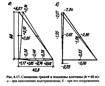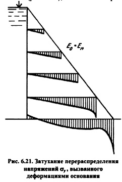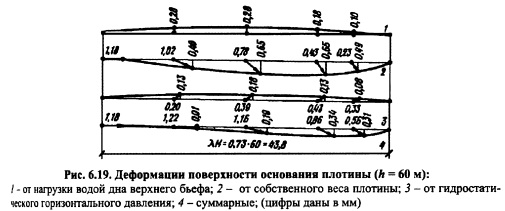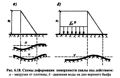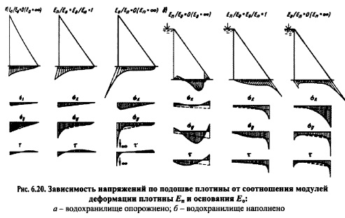 РАСЧЕТ НАПРЯЖЕНИЙ В ГРАВИТАЦИОННОЙ ПЛОТИНЕ И ЕЕ ОСНОВАНИИ, СОВМЕСТНО РАБОТАЮЩИХ КАК ЕДИНЫЙ КОМПЛЕКСРасчеты напряженного состояния гравитационной плотины, изложенные в пп. 6.3 и 6.4, исходили из теории бесконечного клина. При конечной высоте клина плотины треугольного профиля, поставленной на основание в виде бесконечной полуплоскости, на контакте плотины с основанием возникает перераспределение напряжений по подошве плотины и в ее теле, вызываемое совместностью деформаций контакта плотины и основания. Напряжения здесь существенно зависят от упругих свойств плотины и основания, т.е. от соотношения их модулей нормальной упругости (деформации) Е„ и Е0, а также от коэффициента Пуассона цп и Цо (индексы «п» и «о» относятся соответственно к плотине и основанию). Решение данной контактной задачи оказывается очень сложным и трудоемким. Деформации плотины и основания. В формировании напряженного состояния на контакте плотины и ее основания существенную роль играет различие в деформациях собственно плотины и деформациях основания, возникающих под нагрузкой от плотины. Рассмотрим эти деформации на примере, приводимом Ф. Тельке. Плотина треугольного профиля (рис. 6.17), высотой 60 м, шириной по низу 43,8 м, с удельным весом бетона Уб=2,3104 Н/м3, модулем упругости его 20 ГПа. Деформации ее (смещение точек) от давления воды верхнего бьефа и собственного веса, исчисленные для гребня и подошвенного сечения, показаны на рис. 6.17, а в искаженном масштабе (мм); ее деформации только от собственного веса показаны на рис. 6.17, б. Из рисунка видно, что при наполнении водохранилища гребень плотины отклонится в сторону нижнего бьефа на 6,07 мм, или на 0,01% высоты. Подошвенное сечение как бы прогнется на величину до 0,48 мм, при этом напорная грань по этому сечению сдвинется на 1,17 мм. В случае опорожненного водохранилища напорная грань деформируется в сторону верхнего бьефа (гребень на 2,84 мм с одновременным ее понижением на 2,07 мм). ![]() Деформации основания происходят под действием нагрузки, передаваемой ему плотиной, и веса воды, заполняющей верхний бьеф. Нагрузка от плотины считается «гибкой» по эпюре напряжений в подошвенном шве Сту и т (или суммарно р) нагрузка от воды верхнего бьефа равномерно распределена (рис. 6.18). Характер деформации основания, подсчитанных исходя из теории Бусси неска о напряженном состоянии полуплоскости, под действием указанных нагрузок показан на рис. 6.18 (и горизонтальные, v вертикальные смещения). В первом случае (рис. 6.18, а) основание под плотиной оседает, а во втором (рис. 6.18, б), наоборот, выпучивается. ![]() Для указанной выше плотины высотой 60 м Ф. Тельке просчитал смещения основания в разных случаях нагружения в предположении, что модуль деформации основания Е0 тот же, что и у плотины (Е„ =Е0). На рис. 6.19 эти смешения показаны в виде кривых. Из сопоставления кривой 2 и данных рис. 6.17, б видно, что смещение поверхности основания значительно больше, чем смещение точек подошвы плотины, основание должно «оторваться» от подошвы; из сопоставления кривой 4 суммарной деформации основания и данных рис. 6.17, а (деформация подошвы плотины) видно, что смещения также различны как по вер тикали, так и по горизонтали. Если же модуль деформации основания ?0 будет отличаться от модуля упругости плотины Еп, то расхождения в деформациях подошвы плотины и поверхности о