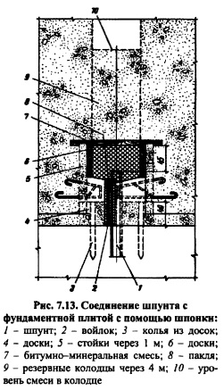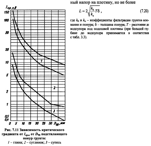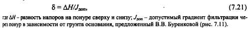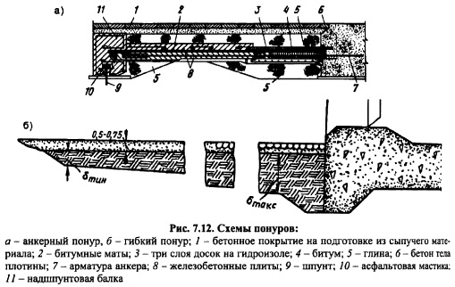 ЭЛЕМЕНТЫ ПОДЗЕМНОГО КОНТУРАПонуры. По степени водонепроницаемости понуры подразделяют: на водонепроницаемые и слабоводопроницаемые (с коэффициентом фильтрации около 106 см/с). Первые используют при глинистых и суглинистых грунтах основания, вторые при песчаных и супесчаных. Длина понура принимается (14,5), иногда до 2,5. ![]() При большей длине понур становится не эффективным. По конструктивным решениям понуры подразделяют на гибкие и жесткие. Гибкий понур должен отвечать требованиям деформативности следовать за деформациями основания, поэтому его выполняют из деформируемых материалов глин, суглинков, асфальта, глинобетона, синтетических материалов. Водопроницаемость материала понура должна быть в 50-100 раз и более меньше водопроницаемости основания. Длину понура назначают на основе сравнения вариантов подземного контура. При напорах до 15 м обычно применяют суглинистые, глинистые и торфяные понуры; при больших напорах глинобетонные, железобетонные с изоляционным покрытием, асфальтовые и комбинированные. Толщину глиняных, суглинистых и торфяных понурое принимают в любом сечении равной ![]() Конструктивная минимальная толщина грунтовых понуров в верхнем конце 0,5 м, у плотины 12 м. Грунт в понур отсыпают на уплотненное основание слоями толщиной, зависящей от средств укатки, и затем разминают и укатывают. При легких катках толщина слоя 1015 см, при тяжелых 0,25 м и более. При уплотнении грунт увлажняется до оптимальной влажности (см. гл. 11). Глинобетонные понуры состоят из грунтов, в которых содержится (%): 20-25 глины, 30-40 песка и 35-40 гравия. Сверху понур защищается бетонным покрытием толщиной до 50 см на подготовке из сыпучего (песчаного, песчано гравелистого) и дресвянощебенистого материалов(рис. 7.12).. Эта бетонная площадка часто используется при производстве работ для размещения строительных механизмов и складских помещении. Нельзя допускать образования щели между понуром и плотиной, так как, например, щель шириной 1 см полностью выводит понур из строя как противо фнлътрационную конструкцию. Шов между понуром и бетоном плотины делают наклонным, что обеспечивает сползание глины под напором воды и уплотнение щели, если она образуется. Вводят также дополнительные уплотнения в виде гибких матов, запускаемых в глину, и др. (рис. 7.12, а). Необходимо следить, чтобы при укладке в грунте не было трещин и плохо уплотненных мест. Жесткий понур устраивают чаще на плотных основаниях в виде покрытий из бетона и железобетона с разрезкой их швами на отдельные плиты и устройством гидроизоляционных уплотнений в швах. В плитах возможно образование трещин, поэтому для предотвращения фильтрации воды через них устраивают покрытия из битума с армирующими прокладками рулонной стеклоткани или наклейкой рулонных гидроизоляционных материалов в несколько слоев (геотекстиля), укладываемых внахлестку, с перекрытием стыков уложенного слоя последующим слоем или сваркой стыков. При напорах до 10 м применяют бетонные плиты без гидроизоляционных покрытий. Толщину бетона при этом назначают исходя из допустимых градиентов напора фильтрационного потока, определяемых опытным путем (ориентировочно Удоп<20ч30). Для повышения градиентов применяют водонепроницаемые покрытия на бетонных плитах, к примеру, на основе эпоксидных смол, геотекстиля, возможно и битума. ![]() Анке