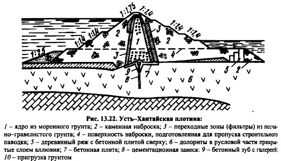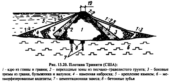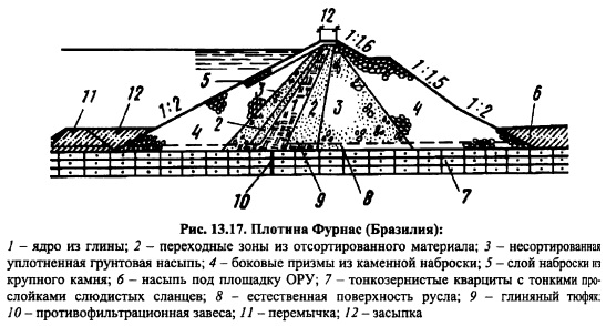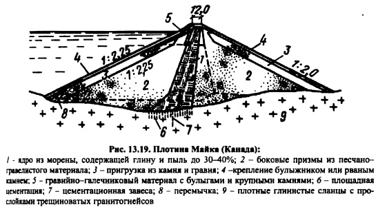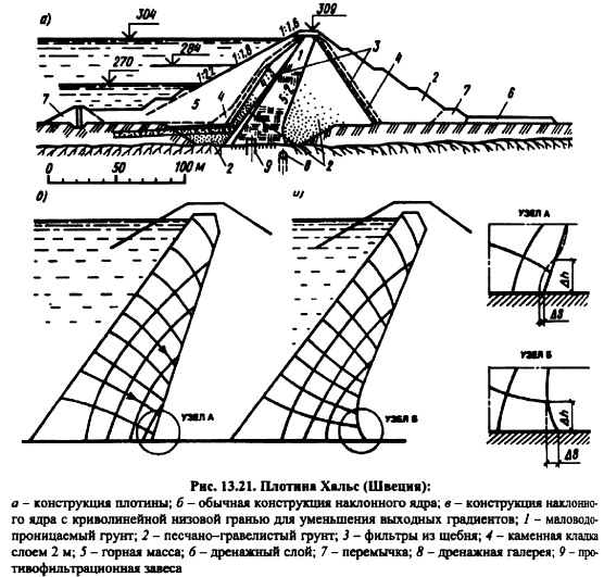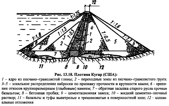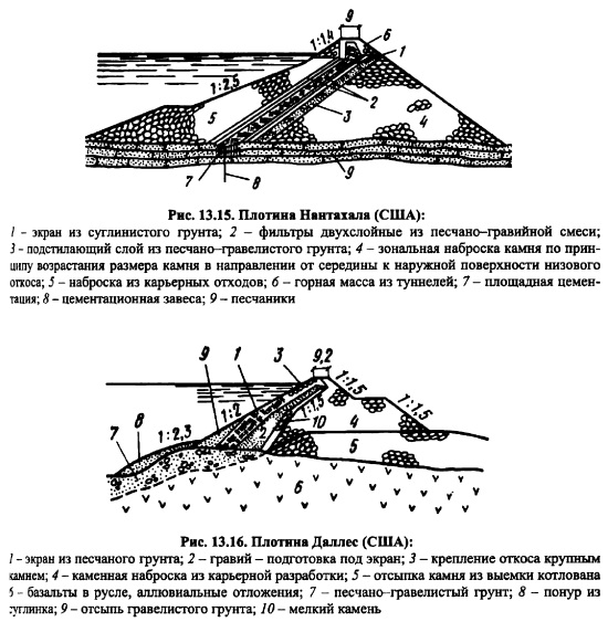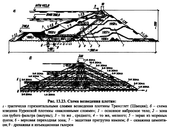 КАМЕННО-ЗЕМЛЯНЫЕ ПЛОТИНЫКаменноземляные и каменные плотины занимают ведущее место среди высоких и сверхвысоких сооружений в мировом плотиностроении. Особенно заметный прогресс наметился в 5060е годы, когда было начато и осуществлено строительство таких плотин, как Оровилл (Канада) высотой 220 м, Нурек ская (Таджикистан) 300 м, Чарвакская (Узбекистан) 168 м, Гепач (Австрия) 150 м, Инфернильо 140 м (Мексика) и др. Столь значительный прогресс в строительстве каменноземляных плотин объясняется бурным развитием землеройной техники, созданием самосвалов грузоподъемностью до 180 т и, как следствие этого, снижением стоимости земельноскальных работ; полной механизацией всего технологического цикла по возведению плотины; использованием грунтов из полезных выемок и развитием некоторых разделов механики грунтов, главным образом, нарушенной структуры [122]. Каменноземляные плотины самые надежные и простые в эксплуатации плотины. Их строят в тяжелейших сейсмических (до 9 баллов) и климатических условиях. Крутизна откосов, а, следовательно, объем плотины, определяется на основании расчета устойчивости откосов плотины и зависит от прочностных свойств материалов, слагающих тело плотины и основание, конструкции плотины, условий эксплуатации, метода производства работ и даже очередности возведения отдельных частей плотины. Не все эти факторы находят отражение в изложенных выше (см. гл. 11 и 12) методах расчетов, что объясняется несовершенством имеющегося расчетного аппарата. Во многих случаях проектировщикам приходится обращаться к аналогам строящегося сооружения, поэтому выбор аналога ответственная и очень нужная часть комплекса работ при проектировании. Следует стремиться выбирать аналог не более 20летней давности строительства. Обычно выбирают не одно, а несколько аналогичных сооружений. Как уже отмечалось в гл. 11, каменноземляные плотины по конструкции классифицируют на плотины с центральным ядром, плотины с экраном и плотины с наклонным ядром (промежуточная конструкция). Типичным примером плотины с центральным ядром являются Нурекская (рис. 12.23) и Инфернильо (рис. 12.6) и др; с экраном Нантахала (рис. 13.15), Даллес (рис. 13.16), Вилюй ская и др.; с наклонным ядром Оровилл, Фурнас (рис. 13.17), Кугар (рис. 13.18), Майка (рис. 13.19) и др. ![]() Выбор типа каменноземляной плотины определяется наличием грунтов для упорных призм, ядра и переходных зон, климатом в районе строительства, геологическими условиями створа, компоновкой гидроузла в целом, гидрологическими условиями в створе и т. д. ![]() Каждая из перечисленных плотин имеет свои достоинства и недостатки. Главная задача при проектировании найти место в профиле плотины наиболее дешевым грунтовым материалам с учетом специфики их свойств, чтобы стоимость плотины была минимальной без снижения надежности сооружения [122]. ![]() ![]() Для этого необходимо иметь подробную информацию о свойствах грунтов и знать работу грунтового сооружения. Плотина с центральным ядром имеет минимальный объем тела по сравнению с плотинами с экраном или наклонным ядром, так как самый слабый по прочности материал ядра наиболее удален от поверхности откосов. Именно этот факт и обусловил широкое распространение этого типа каменноземляной шотины. Ядра плотин по своей толщине подразделяют на тонкие и массивные. Тонкими называют ядра, у которых 