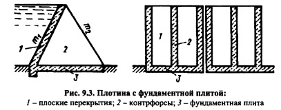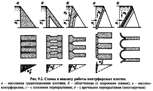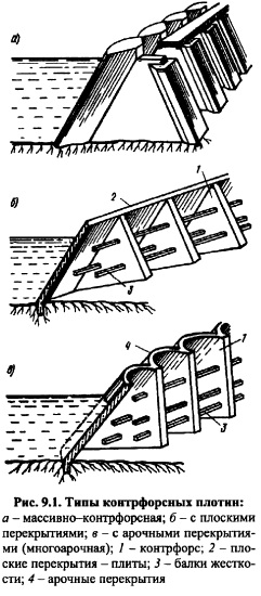 ОБЩИЕ СВЕДЕНИЯ. КЛАССИФИКАЦИЯКонтрфорсные плотины (рис. 9.1) состоят из отдельно стоящих контрфорсов (ребер, стенок), пространство между которыми перекрыто напорной конструкцией в виде плит, консольных утолщений контрфорсов, арок. Давление воды, наносов и других нагрузок, действующих на напорное перекрытие, передаются через контрфорсы на основание либо непосредственно при прочном скальном основании, либо через фундаментную плиту: частичную при слабых скальных основаниях или сплошную при нескальных. Профиль контрфорсной плотины обычно характеризуется наклоном верховой грани (рис. 9.2, вд). ![]() Контрфорсные плотины так же, как и гравитационные, сопротивляются действию горизонтального давления воды за счет сил сопротивления сдвигу по основанию. Однако для обеспечения их устойчивости требуется меньшая масса плотины по сравнению с массой гравитационной плотины, вследствие вовлечения в работу на сдвиг пригрузки напорной грани водой Wi и практически полного снятия фильтрационного давления Яф в основании плотины при отсутствии фундаментной плиты (рис. 9.2). Экономия объема бетонной кладки в контрфорсной плотине по сравнению с гравитационной зависит от наклона верховой грани плотины, определяющего величину пригрузки водой, и при прочных скальных основаниях (отсутствие фундаментной плиты) достигает 20-40% (иногда 60%); при этом экономия стоимости составляет 15-35%, вследствие того, что 1 м3 бетона контрфорсных плотин на 510% дороже 1 м3 бетона гравитационных плотин из-за большого количества опалубки и некоторого усложнения работ. В контрфорсных плотинах на нескальных основаниях при наличии фундаментной плиты (рис. 9.3) фильтрационное давление не уменьшается по сравнению с таковым в гравитационной плотине; экономия бетона при этом будет несколько меньшей, но может быть увеличена за счет пригрузки фундаментной плиты грунтом. ![]() При прочных скальных основаниях с высокими характеристиками tg(p и с устойчивость контрфорсной плотины против сдвига может не определять ее профиля; в этом случае при относительно небольшой высоте плотины ее верховую грань по производственным и другим условиям иногда принимают вертикальной или слабонаклоненной. В общем случае следует стремиться к увеличению наклона верховой грани контрфорсной плотины (к увеличению угла аь см. рис. 6.7), однако это может привести к появлению растягивающих напряжений на напорной грани [см. формулу (6.22)], что нежелательно. ![]() Контрфорсные плотины классифицируют в основном по типу напорного перекрытия. По этому признаку различают контрфорсные плотины: а) с массивными оголовками или массивноконтрфорсные (см. рис. 9.2, в);б) с плоскими перекрытиями плитами (см. рис. 9.2, г); в) с арочными перекрытиями или многоарочные (см. рис. 9.2, д). По типу контрфорсов различают плотины с одиночными и сдвоенными (или парными) контрфорсами (см. рис. 9.9 и 9.10, д) или сквозными. Контрфорсные плотины строят и глухими и водосбросными. Контрфорсные плотины классифицируют и по другим признакам [15]. Контрфорсные плотины сравнительно небольшой высоты строились еще в XV1-XIX вв. Они имели вертикальные напорные грани и выполнялись из каменной кладки на растворе. Более интенсивно контрфорсные плотины стали строить в конце XIX начале XX в., что связано с использованием бетона и железобетона при возведении плотин. В настоящее врем