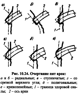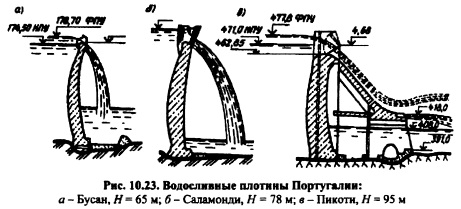 КОНСТРУКЦИИ АРОЧНЫХ ПЛОТИНМатериал. Наиболее распространенный материал арочных плотин бетон. По своим качествам он должен удовлетворять тем же требованиям, что и бетон для массивных плотин; большую роль здесь играет прочность. В современных арочных плотинах допускают весьма высокие напряжения: сжимающие до 10-13 МПа (100-130 кгс/см2), растягивающие до 2,53 МПа (25-30 кгс/см2). Поэтому в арочных плотинах применяют бетон более высоких классов, чем в гравитационных плотинах В20, В25 и более. Гребень н грани глухих плотин. Толщина арочных плотин поверху обычно очень мала от 1,5 до 24 м, поэтому устройство дороги по плотине требует специального уширения, обычно балочноконсольного типа. Напорная грань в целях повышения ее водонепроницаемости иногда покрывается торкретом или окрашивается битумом; низовая грань большей частью никаких облицовок не имеет. В суровых климатических условиях с целью защиты плотины от неблагоприятных воздействий температуры наружного воздуха с низовой стороны ее устраивается теплоизоляционная стенка. В Норвежских арочных плотинах Слеттедален и Юванн утепляющие стенки выполнены из сборных железобетонных плит толщиной 12 см, закрепленных на специальных выступах на расстоянии 80 см от низовой грани плотины. Армирование арочных плотин. Арочные плотины обычно выполняют бетонными; железобетонными и сильно армированными арочные плотины строят редко. Даже в очень тонкой арочной плотине Гаж, в которой сжимающие напряжения составляют 10 МПа (100 кгс/см2), а растягивающие до 8 МПа (80 кгс/см2), арматура поставлена лишь в местах, где растягивающие напряжения превосходят 2 МПа (20 кгс/см2). В бетонных арочных плотинах арматуру ставят лишь там, где могут возникнуть большие местные концентрации напряжений (у смотровых, водосбросных и других отверстий и галерей, в местах перелома профиля, в устьях несквозных швов и т.п.). Армирование производится также у наружных поверхностей плотины для ограничения температурных трещин (например, в виде сетки, размером ячейки 10x10 см, диаметром 4 мм или 50x50 см диаметром 16 мм), у поверхностей конструктивных швов, например контурных (см. рис. 10.21), в верхних арках плотины для восприятия напряжений при сейсмических воздействиях, у подошвы плотины на отдельных участках, где выклиниваются ослабленные прослойки и т. п. Расход арматуры в арочных плотинах обычно не превышает 45 кг на 1 м3 бетона, иногда достигает 1014 кг/м3 и больше. Устройство водосбросов в арочных плотинах. Устройство водосливов в теле арочной плотины является более экономичным решением, чем устройство водосбросов в берегах. Вследствие особенностей профиля арочных плотин образование правильной криволинейной водосливной поверхности на них потребовало бы значительного утолщения арок. В плотинах значительной толщины иногда удается при малых расходах воды образовать водосливную грань без дополнительных затрат бетона. На некоторых арочных плотинах водосливная грань выполнена в виде водосливной плиты, пристроенной со стороны нижнего бьефа или в виде быстротока трамплина (рис. 10.23, в). ![]() Более целесообразно в арочных плотинах устройство водосливов по принципу свободно падающих струй. При этом оголовку водослива придается своеобразная форма (рис. 10.23, а) для отброса струи от плотины. Толщина переливающегося слоя на водосливе ограничивается 24 м. На р
