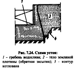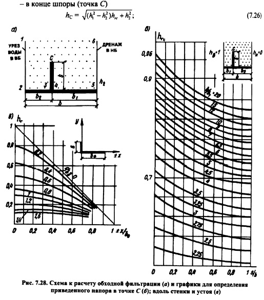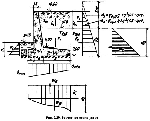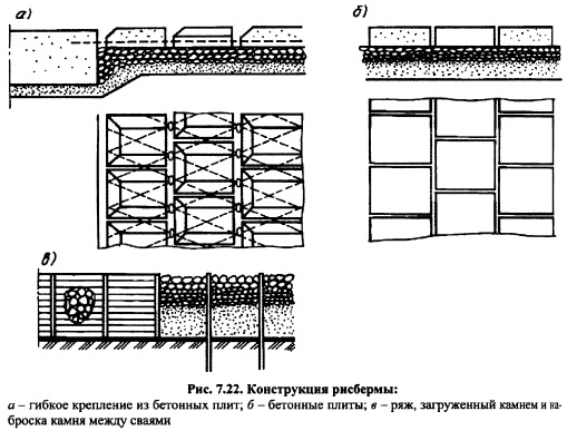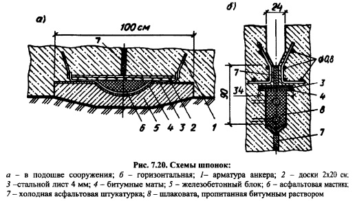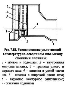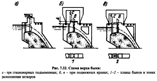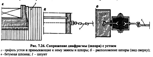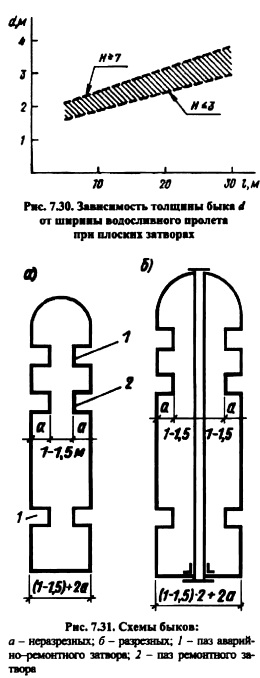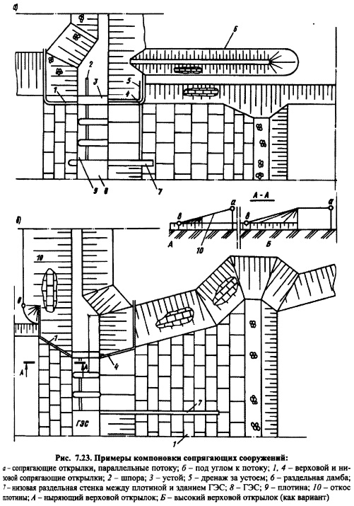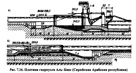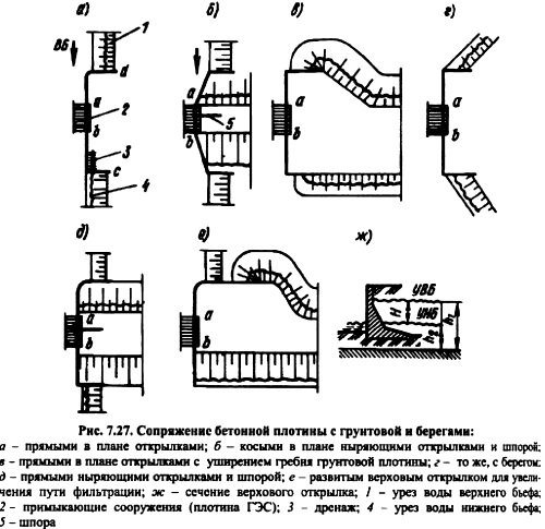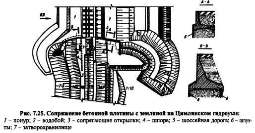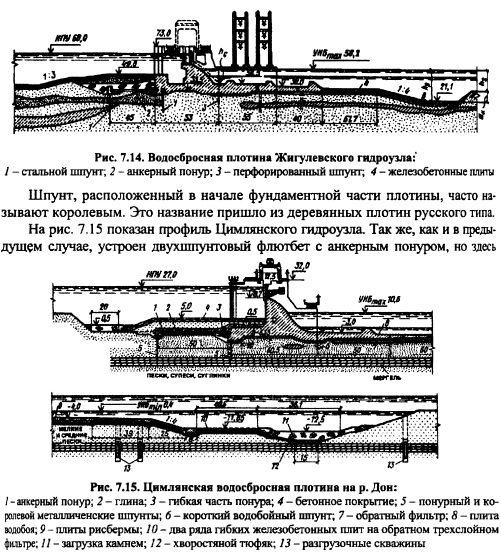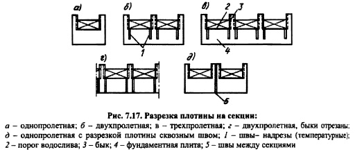 КОНСТРУКЦИИ ПЛОТИН И УСТРОЙСТВ НИЖНЕГО БЬЕФАВ зависимости от грунтов основания ширина подошвы плотины иногда достигает 1,3 при песчаном основании и 2,2 при глинистом. Водослив, как правило, выполняется практического профиля; на гребне водослива часто делается горизонтальная вставка для удобства размещения затворов. Гашение энергии сбрасываемой воды осуществляется на водобойной плите устройством колодца, водобойной стенки или комбинации из колодца и водобойной стенки. Практически всегда на водобойной плите располагаются гасители. На небольших реках при малых напорах водосливные плотины устраиваются в виде широкого порога. Примеры конструкций построенных плотин. На рис. 7.14 показан профиль водосбросной плотины Жигулевского гидроузла на р. Волга. Профиль плотины выполнен по координатам КригераОфицерова. Несмотря на песчаное основание устойчивость облегченной плотины обеспечивается анкерным понуром и пригрузкой воды со стороны ВБ. Дренаж удален от напорной грани и практически расположен под водобойной плитой. В основании расположены четыре ряда шпунтов. Короткие шпунтовые ряды под водобойной плитой имеют вспомогательное значение, обеспечивая механическую устойчивость песчаного грунта основания перед выходом фильтрационного потока в дренаж (шпунт перфорированный, что обеспечивает его фильтрационную проницаемость). Основной висячий шпунт располагается с верховой стороны плотины, имеется также шпунтовый ряд с верховой стороны понура. Он перерезает сильно проницаемый песчаный слой в основании. ![]() ![]() Шпунт, расположенный в начале фундаментной части плотины, часто называют Королевым. Это название пришло из деревянных плотин русского типа. На рис. 7.15 показан профиль Цимлянского гидроузла. Так же, как и в предыдущем случае, устроен двухшпунтовый флютбет с анкерным понуром, но здесь шпунты забиты до водоупора (полускальный грунт мергель). Дренаж расположен под всем основанием плотины, что оказалось возможным из-за применения двух шпунтовых радов, забитых до водоупора. Гашение энергии осуществляется с помощью водобойной стенки и гасителей. Низконапорная плотина гидроузла АльБаас создана с помощью советских специалистов на р. Евфрат в САР (рис. 7.16). Плотина построена на гравийнопесчаном основании. Наличие валунов в основании, сделавших невозможным забивку шпунта, и низкий напор позволили построить плотину без шпунтовых рядов, развив водонепроницаемый профиль за счет понура (3,5 Ятах). Дренаж устроен под плотиной. Сброс воды осуществляется через водослив с широким порогом. Верховой открылок высокий. ![]() Разрезка плотины швами. Во избежание недопустимо больших напряжений в различных частях бетонной плотины на нескальном основании, появляющихся при неравномерных осадках основания и при температурных деформациях, плотину делят на секции постоянными сквозными температурно осадочными швами. Разрезку плотины сквозными поперечными швами производят чаще по быкам (рис. 7.17), чтобы избежать неравномерных осадок смежных быков, что может привести к заклиниванию затворов. При строительстве на глинистом основании в силу длительности деформации под нагрузкой и большой вероятности неравномерности осадок во времени разрезается каждый бык, т.е. каждый водосливной пролет имеет возможность независимых деформаций (рис. 7.17, d). 