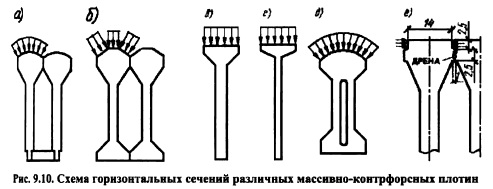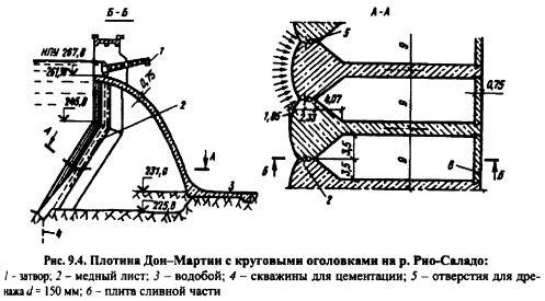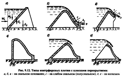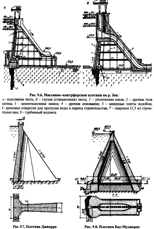 МАССИВНО-КОНТРФОРСНЫЕ ПЛОТИНЫПервая массивноконтрфорсная плотина с одиночными контрфорсами Дон Мартин высотой 39 м (рис. 9.4) была построена в 1929 г. в США по проекту инж. Ф. Нбтцли. В настоящее время эти плотины получили широкое распространение по сравнению с другими контрфорсными плотинами, что объясняется относительной простотой их возведения, малым расходом арматуры, достаточной надежностью, возможностью сооружения в суровых климатических условиях и на относительно слабых скальных основаниях. ![]() Кроме плотины, предложенной Ф. Нётцли, строили массивно контрфорсные плотины других типов: со сдвоенными контрфорсами рис. 9.8 (такие плотины, начиная с 40х годов, получили, по предложению инж. К. Марчелло, широкое применение в Италии, в связи, с чем их часто называют плотинами типа Марчелло); шотландского типа (см. рис. 9.7) и др. Профили массивноконтрфорсных плотин обычно назначают с заложением верховой грани в пределах; заложение низовой грани rnj определяют из условия т\+тг=0,85+1,0. Шаг контрфорсов (или ширина секции плотины) при одиночных контрфорсах обычно не более 16 м, при сдвоенных не более 24126 м. Толщина контрфорсов зависит от напора Н и может быть как переменной, так и постоянной по высоте. Размеры верхового оголовка назначают с учетом их прочности в зависимости от допустимого градиента фильтрации в бетоне и расположения противо филырационных устройств в шве. Примеры плотин. Кировская плотина на р. Талас высотой 83.0 м (рис. 9.5) запроектирована с одиночными контрфорсами толщиной 12 м при шаге их 22 м. Большая толщина контрфорсов принята для облегчения производства бетонных работ (применения «токтогульского» метода бетонирования плотины тонкими слоями). Плотина имеет поверхностные и глубинные водосбросы. ![]() Плотина на р. Зея (рис. 9.6) высотой 111м построена на основании, сложенном диоритами, в суровых климатических условиях с амплитудой колебания температуры до 83° С и с зимними температурами, достигающими 52° С. Заложение напорной грани плотины принято mt=0,15, низовой ш2=0,8. Толщина контрфорсов 7 м при шаге между осями контрфорсов 15 м. ![]() Плотина Джнорра (рис. 9.7) характеризуется наличием широких швов (5=1,5 м) между оголовками контрфорсов, которые заполняют бетоном через несколько месяцев после окончания бетонирования контрфорсов, когда заканчиваются их деформации и усадка бетона; после принятия сооружением напора бетон набухает, появляется обжатие оголовков (до 1,6 МПа), повышающее водонепроницаемость швов. Плотины со сдвоенными (парными) контрфорсами применяют с целью уменьшения числа швов и придания контрфорсам большей боковой устойчивости, что важно для сооружений в сейсмических районах. Наиболее экономичные решения этих плотин были предложены и осуществлены в Италии ннж. К. Марчелло. Грани плотин этого типа (рис. 9.8) обычно имеют одинаковый наклон (1:0,421:0,45), ширина секции 22 м. Плотины с парными контрфорсами более приспособлены для устройства в них отверстий для пропуска строительных расходов, глубинных водосбросов и водоспусков (или турбинных водоводов), которые располагаются в полости между парными контрфорсами (см. рис. ![]() К указанному типу плотин относится Андижанская плотина на р. Карадарья (рис. 9.9) высотой 115 м, длиной по гребню 1180м и с шагом контрфорсов 2Ф26 м. Основание плотины хлоритовые сланцы, трещиноватые, имеются тектонические н
