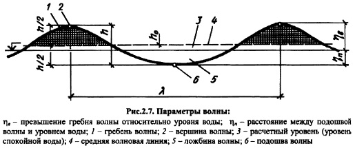За расчетную скорость ветра v принимают скорость на высоте Юм над поверхностью земли обеспеченностью 2% для сооружений I и II классов и 4% для сооружений III и IV классов. Расчетные параметры ветровых волн. При действии ветра на поверхности воды развивается волнение, при котором частицы воды совершают сложное вращательнопоступательное движение. Действие ветра на водную поверхность, образование волн и связанное с ним движение воды вызывают различные волновые нагрузки и воздействия на гидротехнические сооружения: волновое давление (сверх гидростатического) и волновое противодавление (уменьшающее гидростатическое); взвешивающее волновое давление; накат волн на откосы сооружений; размыв дна при небольших глубинах водоемов. Учет волновых нагрузок и воздействий необходим при расчетах гидросооружений, при выборе типов конструкций и их размеров. Величина ветровых нагрузок зависит от вида и параметров волн: высоты, периода т, длины X (рис. 2.7), которые в свою очередь определяются волнообразующими факторами: скоростью ветра v, его направлением по отношению к сооружению; продолжительностью непрерывного действия ветра t; размерами, конфигурацией и глубиной водоема; длиной разгона волны L.