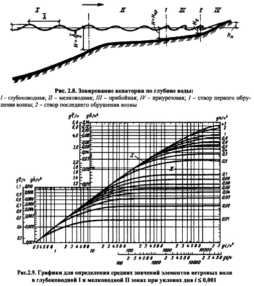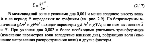 В мелководной зоне с уклонами дна 0,001 и менее среднюю высоту волны й и ее период т определяют по графикам (см. рис. 2.9). По безразмерным величинам gL/v2 и gH/v2 находят параметры gt/v, и по ним вычисляют к и т. При уклонах дна 0,002 и более необходимо учитывать трансформацию (изменение параметров волн вследствие влияния дна), рефракцию волн (изменение направления распространения волн) и другие факторы.