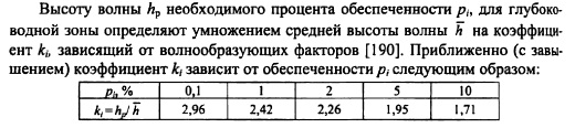 Высоту волны необходимого процента обеспеченности р„ для глубоководной зоны определяют умножением средней высоты волны й на коэффициент ки зависящий от волнообразующих факторов [190]. Приближенно (с завышением) коэффициент kj зависит от обеспеченности р, следующим образом: