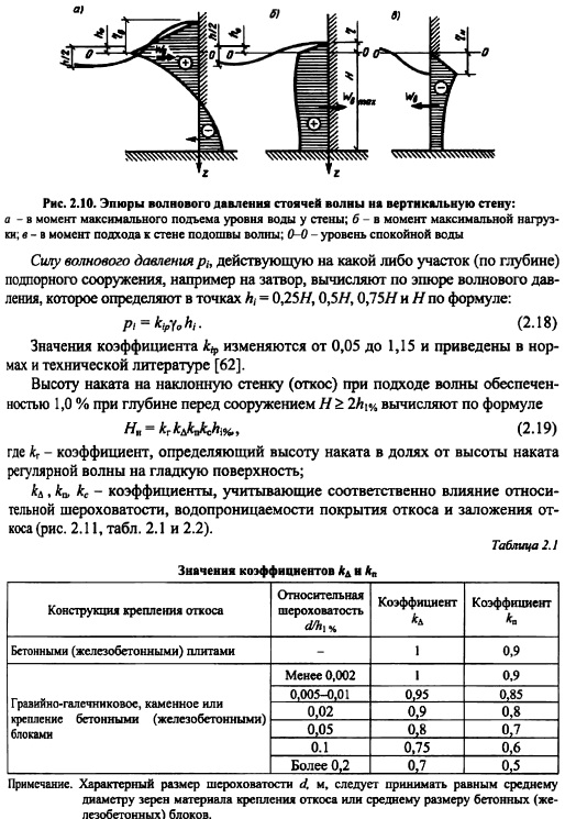 Высота волны отсчитывается от расчетного уровня, который при известной отметке уровня воды в водоеме может изменяться на величину ветрового нагона. Взаимодействие волн и сооружений. При расчете устойчивости и прочности гидротехнических сооружений и их элементов расчетная обеспеченность высоты волн для сооружений с вертикальной напорной гранью и для откосов с креплением бетонными плитами составляет 1%; с креплением каменной наброской 2%; для берегоукрепительных сооружений I и П классов 1 %, III и IV 5%. Волны, подходящие фронтально к вертикальной стенке или близкой к ней, при глубине непосредственно перед сооружением Н > 1,5 преобразуются в стоячие волны (волны, не перемещающиеся в пространстве). Если перед стенкой на участке протяженностью не менее 0,5 X, глубина Н, то на стенку действуют прибойные волны. Расчет воздействия стоячих волн на сооружение заключается в определении возвышения и понижения волновой поверхности у сооружения относительно уровня спокойной воды, а также сил волнового давления и опрокидывающего момента от этих сил. В общем случае моменты максимального подъема уровня воды перед сооружением и максимального значения силы волнового давления не совпадают. Силу волнового давления на сооружение и момент силы определяют по площади эпюры давления. На рис. 2.10 показаны эторы волнового давления на вертикальную стену. При максимальном подъеме уровня воды на нижней части стенки может развиваться отрицательное волновое давление. Эпюра, соответствующая максимальной силе волнового давления, имеет по всей высоте положительный знак; при подходе к стенке подошвы волны волновое давление отрицательно. Для расчета давления стоячих фронтальных волн на вертикальную стенку или близкую к ней широко применяется метод Н.Н. Загрядской [62], который может применяться как для мелководной, так и глубоководной зон. Н.Н. За грядская дала графики для определения коэффициентов, позволяющих рассчитать повышение и понижение волновой поверхности над спокойным уровнем воды, волновое давление, силу давления, моменты сил давления.
