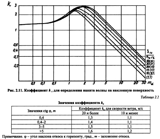 Высоту наката на наклонную стенку (откос) при подходе волны обеспеченностью 1,0 % при глубине перед сооружением вычисляют по формуле Расчеты волновых нагрузок на крепление откосов, обтекаемые преграды, сквозные и берегозащитные сооружения, а также нагрузок от судовых волн выполняют по нормам [189].