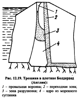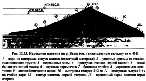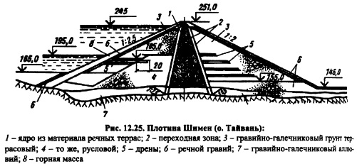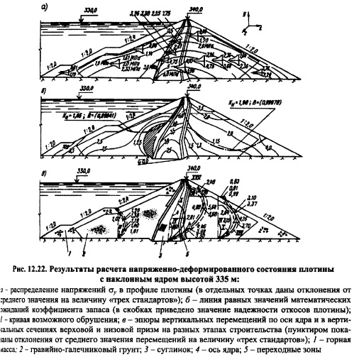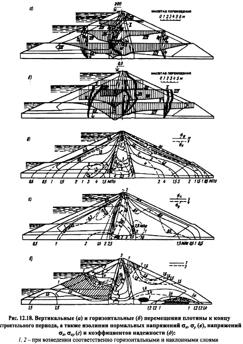 НАПРЯЖЕННО-ДЕФОРМИРОВАННОЕ СОСТОЯНИЕ ПЛОТИНИсследование напряженнодеформированного состояния грунтовых плотин задача исключительно сложная, так как деформативные свойства фунта зависят от очень многих факторов: действующего среднего напряжения Результаты использования численных методов при решении задач применительно к фунтовым плотинам. Метод конечных разностей и метод конечных элементов использовались и используются для решения задач о напряжениях и деформациях в фунтовых плотинах. Эти методы удобны для применения с физическим уравнением в виде закона Гука. Следовательно, физические свойства фунта следует выразить через закон Гука. На рис. 11.9, в качестве примера показана зависимость модуля Юнга и коэффициентом Пуассона от минимального главного напряжения а3 и соотношения главных напряжений oi/стз. При описании свойств грунтов такого рода зависимостями предполагается следующее: прочность грунта не зависит от пути нагружения и времени; оси тензеров главных напряжений и главных деформаций совпадают; грунт квазиоднофазен. Все эти допущения достаточно серьезны, но они позволяют заменить решение о напряженнодеформированном состоянии грунтовой плотины при нелинейных свойствах материала, каким является грунт, последовательным решением ряда линейных неоднородных задач теории упругости, когда в каждом узле при использовании МКР или в каждом элементе при использовании МКЭ можно от решения к решению менять характеристики деформируемости грунта в зависимости от его типа и главных напряжений, действующих в узле или элементе. В настоящее время получено много решений при некоторых дополнительных допущениях. Например, коэффициент Пуассона константа для данного материала (решение С.Я. Гуна для случая плоской и пространственной задач теории упругости), а модуль Юнга зависит только от величины <зу. Величина ?=Доу) в этом случае принимается на основе компрессионных свойств грунта (испытания в одометре). Американские исследователи накладывали ограничения на характер объемных деформаций, принимая связь между средним напряжением в грунте и объемной деформацией в виде линейной функции (модуль объемной деформации константа, модуль сдвига переменная величина). Учет поэтапности возведения исключительно важный элемент решения задачи. В особенности это относится к решению нелинейных задач. Когда решается задача о напряженнодеформированном состоянии плотины без учета поэтапности возведения, то предполагается, что нагрузка распределилась одновременно по всему объему. Такое условие допустимо, когда речь идет о малых строительных формах. Идет монтаж конструкций, а затем создается внешняя нагрузка на готовую конструкцию. К таким конструкциям относятся балки, фермы, колонны и т.д. В этих конструкциях собственный вес не создает основной нагрузки. В массивных конструкциях, когда собственный вес основная доля нагрузки, порядок возведениярост области приложения нагрузки, т.е. появляется новый класс задач: задачи с растущей областью и изменяющейся с ростом нагрузки. Этот класс задач нельзя смешивать с принципом суперпозиции (принципом независимости действия сил), так как последний применим к неизменной в процессе решения задач области. Плотины всех типов (включая арочные) массивные сооружения, которые должны решаться с у