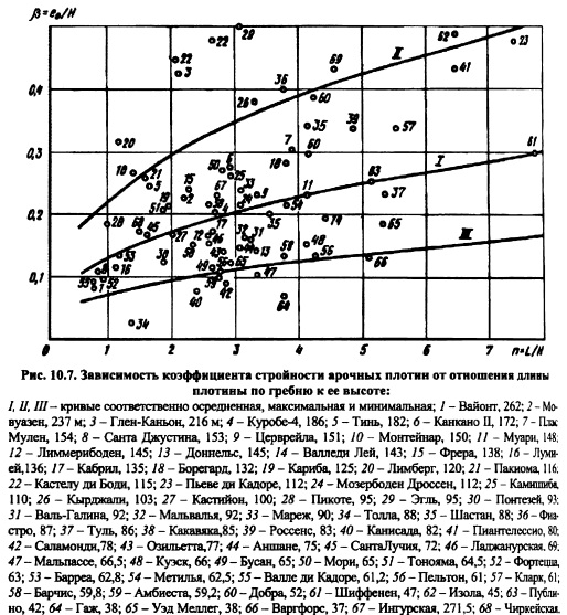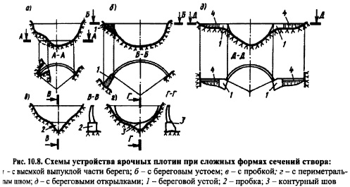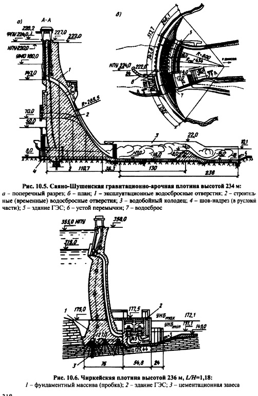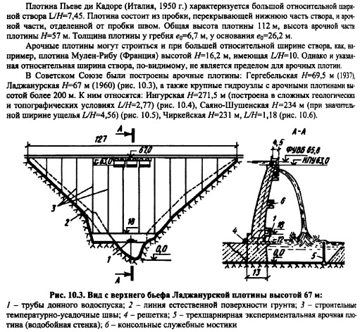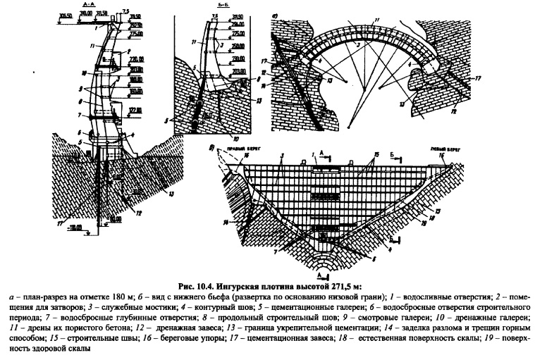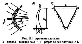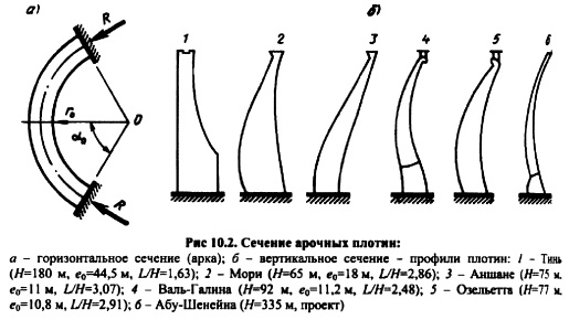ОБЩИЕ СВЕДЕНИЯХарактеристика арочных плотин. Арочными плотинами называют криволинейные в плане водоподпорные сооружения, работающие как свод или оболочка и сопротивляющиеся действию горизонтальных нагрузок в основном за счет упора их в берега ущелья (рис. 10.1). ![]() Горизонтальные сечения арочных плотин (арки) обычно имеют круговое очертание с нормальным опиранием пят арок в берега (рис. 10.2, а). Поперечные профили арочных плотин (консоли) весьма различны по форме и в ряде случаев назначаются криволинейными по вертикали (рис. 10.2, б). ![]() По характеру работы на основную сдвигающую нагрузку горизонтальное давление воды арочные плотины принципиально отличаются от гравитационных. В арочных плотинах силы сопротивления по подошве сооружения, зависящие от веса сооружения, принимают малое участие в работе плотины прогав сдвига. Устойчивость их обеспечивается в основном за счет упора сооружения в берега. Это позволяет проектировать арочные плотины с весьма малой толщиной, определяемой лишь условием прочности материала сооружения. Профили арочных плотин значительно более обжаты по сравнению с профилями гравитационных плотин и характеризуются так называемым коэффициентом стройности р относительной толщиной плотины, равной максимальная толщина плотины в ключевом сечении (без учета пробки), чаще всего е0 толщина плотины у основания; Я высота арочной части плотины. Для тонких арочных плотин Р<0,2, для гравитационных плотин Р=0,6- 0,8. Наиболее стройными из построенных арочных плотин являются плотины. Таким образом, толщина арочных плотин (и, следовательно, объем бетона на 1 м длины) меньше, чем гравитационных в 24, иногда в 68 раз и более. Общая экономия бетона вследствие кри волннейносги арочных плотин в плане несколько меньше и для современных арочных плотин составляет 35-65% [151], Для весьма стройных арочных плотин экономия бетона может достигать и больших значений. Так, в арочной плотине Гаж (Франция), имеющей 38 м, (1,8 м и (3=0,047, объем бетона составил 18% объема бетона в гравитационной плотине. При определении экономичности арочных плотин следует учитывать, что к бетону арочных плотин предъявляются более высокие требования, и, следовательно, его стоимость выше, чем в гравитационных плотинах, однако удорожание I м3 бетона обычно не превышает 10-15 %. Высокая экономичность арочных плотин при одновременной их надежности объясняет их широкое распространение; в настоящее время построено более 300 арочных плотин высотой свыше 30 м. Первая арочная плотина Понте Альто, построенная в 1611 г. в Италии, была каменной (на растворе) с радиусом 15 м и высотой 5 м. В дальнейшем ее несколько раз достраивали и в 1883 г. ее высота составила 38 м. В XIX в. небольшие арочные плотины строились в Европе и США, но наибольшее распространение эти плотины получили в XX в. Самой высокой из построенных за рубежом арочных плотин является плотина Вайонт (Италия, I960 г.), имеющая высоту 266 м. Плотина возведена в относительно узком ущелье (отношение длины плотины по гребню L к высоте плотины Я составляет УН =0,71). Толщина плотины у гребня 3,9 м, у основания 23 м. Существуют проекты н более высоких плотин: плотина Абу-Шенейна (Судан) высотой №335 м (см. рис. 10.2, б, 6). Плотина Толла (Франция, о. Корсика, 1961 г.) является одной из наиболее стройных арочных плотин. Высота плотины Я 88 м, толщина плотины в ключевом сечени