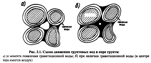 Гравитационную и капиллярную воду называют часто грунтовой водой. Истинная структура грунта значительно сложнее, чем представленная схема. В ней имеются коллоидные вещества, откладывающиеся на поверхности минеральных частиц. Эти коллоидные оболочки впитывают и химически соединяются с сорбируемыми водяными парами. Однако химическому взаимодействию имеется предел, после чего впитывание воды и разбухание коллоидных оболочек может происходить без химических реакций.