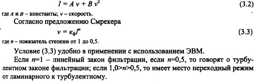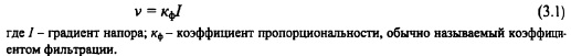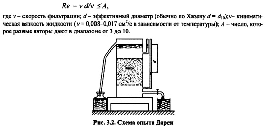 Многочисленные исследования фильтрации в мелких грунтах подтвердили выводы, сделанные А. Дарси. Коэффициент фильтрации имеет размерность скорости, т.е. он равен скорости фильтрации при градиенте, равном единице. Но линейный закон Дарси (3.1) имеет пределы применимости. Верхний предел применимости выражается числом Рейнольдса (Н.Н. Павловский, 1922 г.)