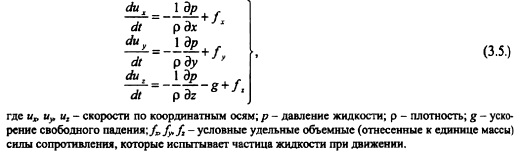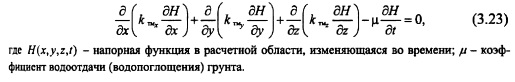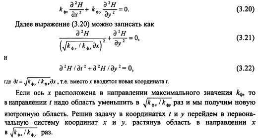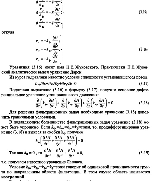 Коэффициент фильтрации глинистых грунтов (глины, суглинки, супеси) может меняться во времени в результате изменения агрегатной структуры грунта и химической суффозии (см. п. 3.3). В общем случае коэффициент фильтрации зависит от температуры вода, например, по Хазену, (0,7 + 0,03°), где Аю коэффициент фильтрации при 10° С. Уравнения движения грунтовых вод. В каждой из пор грунта движущаяся вода имеет свой по значению и направлению вектор скорости. Меняются от поры к поре и ускорения. Это делает невозможным изучение скорости отдельных частиц воды для оценки общей картины движения воды в пористой среде. Удобнее рассматривать осредненные скорости в некотором объеме. Задача еще более упростится, если мы условно примем, что вода заполняет весь объем, включая объем, занятый минеральными частицами. В этом случае будем иметь сплошной поток, движущийся с фиктивными скоростями, так как действительные осредненные скорости будут больше за счет того, что действительный поток движется только по порам. Если выбрать в системе координат ось z, направленную вертикально вверх, то уравнения установившегося движения Эйлера [89] отдельных частиц жидкости в порах имеют вид: ![]() ![]() ![]() ![]() В скобках имеем потерю напора на участке ds, т.е. АР/у +Az = Тогда сила сопротивления, отнесенная к единице массы, составит Если силу сопротивления отнесем к единице объема, т. е. выражение (3.11) умножим на р (плотность воды), то получим Отсюда следует, что закон Дарси линейный закон сопротивления, т. е. сопротивление движению пропорционально скорости потока. Это условие было сформулировано еще И. Ньютоном. Поскольку H=z+P/pg, то P=(Hz)pg и Уравнения (3.16) носят имя H.E. Жуковского. Практически Н.Е. Жуковский аналитически вывел уравнение Дарси. Из курса гидравлики известно условие сплошности установившегося потока Подставив выражение (3.16) в формулу (3.17), получим основное дифференциальное уравнение установившегося движения: Для решения фильтрационных задач необходимо уравнение (3.18) дополнить граничными условиями. В подавляющем большинстве фильтрационных задач уравнение (3.18) может быть упрощено. Если продифференцировав уравнение (3.18) и вынеся за скобки кф, получим Если и все эти коэффициенты фильтрации по координатам постоянны, т.е. не зависят от координат, то говорят об области с анизотропными свойствами. В обоих случаях область однородная. Если k=j(x, у, z), то область неоднородная. Чаще всего гидротехники имеют дело с неоднородными анизотропными областями фильтрации, но практически всегда можно свести задачу к кусочно однородной изотропной области или даже к однородной изотропной области. Рассмотрим анизотропную область на примере плоской задачи. В этом случае уравнение (3.18) примет вид: Если ось х расположена в направлении максимального значения к$, то в направлении t надо область уменьшить раз и мы получим новую изотропную область. Решив задачу в координатах x и у перейдем в первоначальную систему координат х и у. растянув область в направлении х ![]() При переходе из координат) к координатам нарушится одно из основных свойств гидродинамической сетки ее ортогональность, т.е. в анизотропной области жвипотенциали не ортогональны линиям тока. На практике обычно решают задачи в плоской постановке, но имеется целый класс задач, когда надо решать пространственные задачи (например, фильтрация при с