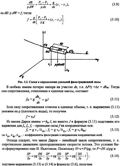 ОСНОВЫ ТЕОРИИ ФИЛЬТРАЦИИ ВОДЫВодоподпорные сооружения (плотины, здания ГЭС, находящиеся в напор ном фронте, шлюзы, рыбоходы и т.д.) испытывают не только разницу давлении воды со стороны верхнего и нижнего бьефов (напор), но и давление воды, движущейся под действием этого напора по порам грунта основания и тела грунтовой плотины (п. 2.3). В этом случае различают две силы: взвешивания и фильтрационную, Движение воды в скальных основаниях имеет свои особенности, В зависимости от состояния воды в порах грунта различают воду в виде: а) водяного пара;б) гигроскопической воды, конденсирующейся на поверхности частиц; в) пленочной; г) свободной. Максимальная гигроскопичность может быть: у песков до 1%, у пылеватых частиц до 7%, у глины до 17%. Пленочная вода образуется на поверхности частиц грунта под влиянием молекулярных сил. Она удерживается на поверхности частиц с силой, значительно превосходящей по интенсивности силу тяжести. Эту воду часто называют связной. Связная вода в грунте отличается по своим свойствам от обычной (меняются температура кипения и замерзания, вязкость, теплоемкость и т. д.). Ее можно отжать из грунта при давлении в несколько десятков и даже сотен МПа с одновременным подъемом температуры. Связная вода имеет пониженную растворяющую способность. Связная вода затрудняет фильтрацию, уменьшая сечение пор грунта. Влажность грунта, соответствующая максимальному содержанию пленочной (связной) воды, названа А.Ф. Лебедевым максимальной молекулярной влагоемко стью. В свободной воде выделяют гравитационную, передвигающуюся в порах грунта под влиянием силы тяжести (в ней действует только гидродинамическое давление), и капиллярную, на которую, кроме того, действуют капиллярные силы. Эта вода заполняет частично или целиком поры грунта и сверху ограничена вогнутым мениском (табл. 3.1) .