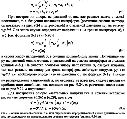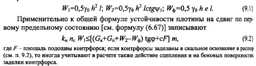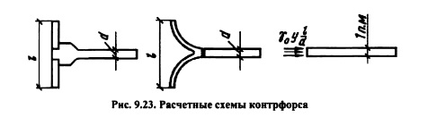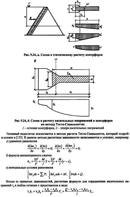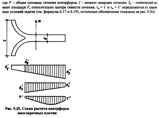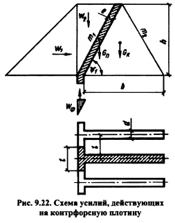 РАСЧЕТ ОБЩЕЙ ПРОЧНОСТИ И УСТОЙЧИВОСТИ КОНТРФОРСНЫХ ПЛОТИНСхема работы контрфорсной плотины и ее устойчивость на сдвиг по основанию. Статические расчеты контрфорсных плотин выполняют для отдельных секций, включающих контрфорс и два полупролета напорного перекрытия (рис. 9.22). Поэтому действующие на секцию силы собираются на длине пролета ![]() Исходя из этого уравнения, подбирают размеры плотины, а также основные параметры: шаг контрфорсов и угол наклона напорного перекрытия к горизонту. При этом следует стремиться к увеличению шага и уменьшению угла, но помнить, что с увеличением шага растут напряжения в напорном перекрытии; последнее влечет за собой или применение железобетона в плитах, или переход к арочным перекрытиям (подробнее см. п. 9.1). Давление, передаваемое от контрфорсов на основание, распределяется в этих плотинах более равномерно по длине контрфорса (это результат пригрузки напорного перекрытия водой Щ). Требования к качеству основания контрфорсных плотин примерно такие же, как и для массивных гравитационных. Большинство контрфорсных плотин построено на скальных основаниях. В случае нескальных оснований (песчаных, суглинистых, гравелистых) применяют контрфорсные плотины ограниченной высоты с устройством фундаментной плиты под всей плотиной (см. рис. 9.3; 9.12). ![]() Расчет прочности контрфорсов. Контрфорсы представляют собой объемное тело в общем случае с переменной толщиной по высоте плотины и различными утолщениями в виде: заплечников для опирания плоских плит перекрытия, консольных оголовков или арочного перекрытия, жестко связанного с контрфорсом, и следовательно, имеют объемное напряженное состояние. В подобной постановке задача о напряженном состоянии конструкции является весьма сложной и может быть решена лишь на основе применения метода конечных элементов (см. п. 6.5) или с помощью модельных исследований (см. гл. 32). В практических расчетах данная задача приближенно сводится к плоской, для решения которой могут использоваться метод теории упругости, метод сопротивления материалов и другие приближенные методы. При применении метода теории упругости рассматривается задача о плоском напряженном состоянии пластинки в виде клина постоянной толщины. Подобная схематизация контрфорса может быть принята для плотин с плоским напорным перекрытием (в этом случае пренебрегают влиянием относительно небольших заплечников с верховой стороны) или многоарочных плотин в случае устройства шва между контрфорсом и арочным перекрытием. Для расчетной схемы, представленной на рис. 9.23, расчет выполняется по тем же формулам, что для гравитационной плотины (см. п. 6.4), с заменой, однако, гидростатического давления на величину или для формул (6.41) с заменой величины. Имеются решения и для контрфорсов с переменной толщиной. [56] ![]() Для расчета напряжений в контрфорсах с массивными оголовками подобная схематизация является слишком грубой; в этом случае более точные результаты могут быть получены при применении элементарного метода расчел (см. п. 6.3). Для расчетной схемы, представленной на рис. 9.24, а, напряжения в горизонтальном сечении контрфорса определяют по формулам (см. п. 6.3): при построении эпюры напряжений сх вначале решают задачу в плоской постановке, т. е. без учета оголовков контрфорса (расчетное сечение контрфорса показ