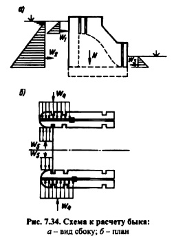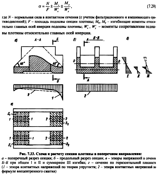 РАСЧЕТЫ ПРОЧНОСТИ ВОДОСЛИВНЫХ ПЛОТИН И ИХ ЭЛЕМЕНТОВРасчеты прочности плотин, их оснований и отдельных элементов производят для наиболее неблагоприятных расчетных случаев эксплуатационного и строительного периодов с учетом последовательности возведения и нагружения плотины. Наиболее распространенным для решения данных задач является метод конечных элементов, позволяющий учесть множество факторов, отражающих свойства грунтовых оснований (см. гл. 8). В инженерных расчетах часто используют более доступные приближенные методы (см. п. 6.3). Для этого предварительно необходимо определить распределение напряжений по контакту бетонной плотины с основанием [116]. Расчет нормальных контактных напряжений производят по формулам вне центренного сжатия и по методу «экспериментальных эпюр», т. е. эпюр, полученных на основе модельных исследований (см. п. 32.13) для несвязных грунтов с относительной плотностью 0,5 (см. 7.12); для связных или несвязных грунтов с относительной плотностью ID > 0,5 по формулам внецентренного сжатия и по методу теории упругости [40]. ![]() При раздельном возведении быков, устоев и фундаментной плиты плотины на песчаном основании эпюра контактных напряжений определяется суммированием контактных напряжений для строительного периода под каждым элементом сооружения и напряжений, полученных в результате приложения дополнительных нагрузок эксплуатационного периода после омоноличивания сооружения. В случае глинистых оснований напряжения определяют аналогично, яо с учетом их перераспределения во времени из-за консолидации глинистого основания (см. п. 12.3). Расчет нормальных контактных напряжений в угловых точках фундаментной плиты секции плотины при использовании метода сопротивления материалов производится по формуле внецентренного сжатия: В расчетах прочности секции плотины часто используют обе эпюры контактных напряжений, полученные по формуле внецеытренного сжатия н методу «экспериментальных эпюр» или теории упругости как для балки на упругом основании. При этом может быть получена значительная разница результатов (рис. 7.33, а). Обычно если изгибающие моменты, вычисленные по каждой из указанных эпюр, имеют разные знаки, то расчет прочности ведете по обоим моментам, но с уменьшением каждого из них на 10% суммы их абсолютных значений. При одинаковых знаках изгибающих моментов расчет ведется по большему значению с уменьшением его на 10% разности моментов. Такой подход объясняется тем, что действительные контактные напряжения, замеренные в натурных условиях, отличаются от напряжений, полученных элементарным методом и методом теории упругости, хотя ближе они к первым [134]. Расчеты общей прочности секций плотин I и И классов проводят как для пространственных конструкций совместно с упругим основанием методами строительной механики или теории упругости [116]. В настоящее время основу расчетов составляют численные методы метод конечных элементов (см. гл. 6), метод конечных разностей и т. д. ![]() Расчеты прочности плотин III и IV классов, а также предварительные расчеты плотин I и II классов выполняют упрощенными методами строительной механики. При этом раздельно рассматривают работу секции в поперечном (вдоль потока) и продольном (поперек потока) направлениях Расчеты секции плотины в поперечном направлении производят для в