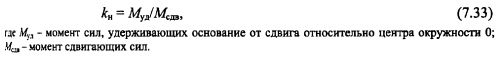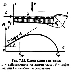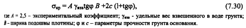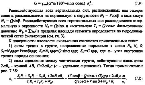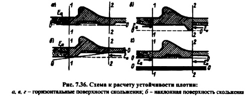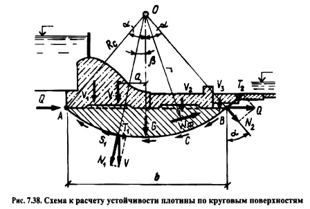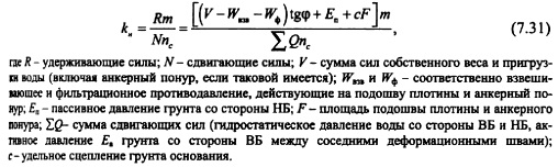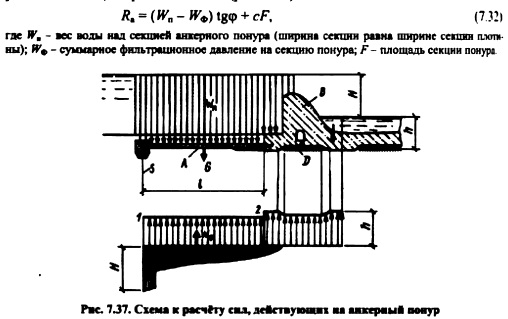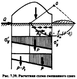 РАСЧЕТ УСТОЙЧИВОСТИ БЕТОННЫХ ПЛОТИН НА НЕСКАЛЬНЫХ ОСНОВАНИЯХПотеря устойчивости бетонной плотины на нескальном основании под действием собственного веса может происходить по контакту подошвы плотины и основания плоский сдвиг, по некоторой поверхности в основании достаточно сложного очертания [184]. ![]() На основе исследований было устанонлено, что если контактные нормальные напряжения не превосходят некоторого критического значения, то сдвиг носит плоский характер; в противном случае глубинный. Рассмотрим процесс сдвига плотины на примере сдвига плиты. Схема вертикальной и горизонтальной а действующие на штамп силы; б график сил. На рис. 7.35, а показана плита, на несущей способности основания которую действуют вертикальная сила, вызывающая появление осредненных нормальных напряжений а, и горизонтальная сила, вызывающая появление касательных напряжений т. Представим, что действует только вертикальное напряжение а (рис. 7.35, б). В этом случае предельное касательное напряжение т связано с напряжением а законом Кулона. До тех пор, пока (рис. 7.35, б), возможные максимальные касательные напряжения будут подчиняться закону Кулона. Когда нормальные напряжения начнут превышать касательные напряжения начнут снижаться по сравнению с касательными напряжениями по закону Кулона, так как по краям штампа начнут развиваться зоны предельного равновесия (на рис. 7.35, а) пунктирная линия). Развитие зон предельного равновесия под действием вертикальной нагрузки будет быстро нарастать и при ст = Стпр штамп под действием вертикальных сил потеряет устойчивость. Зоны предельного равновесия под штампом сомкнуться, и его несущая способность иссякнет, т.е. горизонтальную нагрузку приложить к штампу не удастся. Таким образом, расчет несущей способности плотины разбивается на два этапа: а) определение критических нормальных напряжений;б) выбор метода расчета в зависимости от действительных нормальных напряжений по отношению к критическим. Для определения критического нормального напряжения существует несколько рекомендаций [40]. Наиболее обоснованная включает параметры прочности основания ![]() В ширина подошвы плотины; ф и с — параметры прочности грунта основания. Расчёт по схеме плоского сдвига. Если Стпии в основании плотины окажется меньше, чем как это часто бывает, то рассматривается плоский сдвиг. Различные варианты плоского сдвига представлены на рис. 7.36, а, в, г. Выбор варианта определяется конструктивными особенностями плотины и геологическим строением основания. Например, наличие ослабленной прослойки в основании приводит к расчетной схеме, показанной на рис. 7.36, г. Коэффициент надежности можно в этих случаях оценить согласно условию прочности на сдвиг Кулона, но в интегральной форме: ![]() В случае наклонной плоскости скольжения необходимо все сдвигающие в удерживающие силы спроектировать на плоскость скольжения [40]. ![]() Расчеты согласно формуле (7.31) обычно выполняют применительно к секции, т.е. подсчитывают все силы, действующие на секцию. Устройство анкерного понура позволяет повысить устойчивость плотины и несколько перераспределить контактные напряжения под плотиной. Обычно анкерные понуры (см. п. 7.3) применяют при строительстве плотины на глинистом основании, так как низкий коэффициент трения бетона по основанию приводит к н