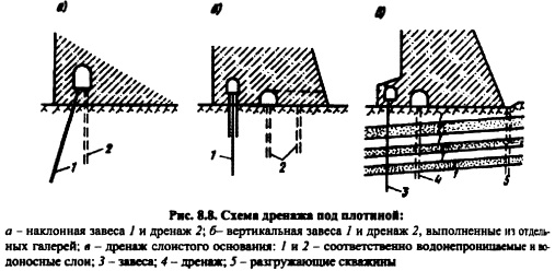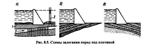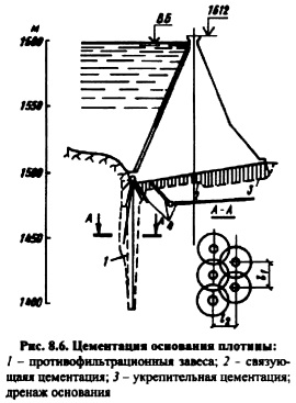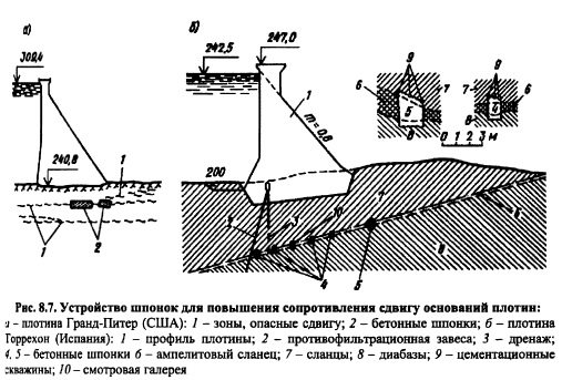 СКАЛЬНЫЕ ОСНОВАНИЯ, ИХ ПОДГОТОВКА И УЛУЧШЕНИЕК скальным основаниям, особенно при возведении на них плотин большой высоты, предъявляются более жесткие требования в отношении их прочности, деформативности и водонепроницаемости, чем к нескальным основаниям, для которых высота плотины ограничивается (см. п. 7.1). В реальных условиях скальные основания (как и нескальные) обычно неоднородны, сложены разными по свойствам горными породами, анизотропны и, как правило, разбиты многочисленными трещинами, наличие которых снижает прочность и увеличивает деформативность основания по сравнению с массивом породы «в куске». Для улучшения свойств и устранения дефектов скального основания обычно проводят специальные работы по их укреплению. Классификация оснований, их состав. Все основания плотин можно разделить на скальные и полускальные. К скальным основаниям относятся массивы прочных пород с жесткими связями между зернами, при этом слагающие их породы характеризуются «в куске» пределом прочности на сжатие более 20 МПа и на растяжение более 1 МПа, модулем деформации более 50 ГПа. Массивы оснований и породы с меньшими приведенных выше показателями относятся к слабым скальным или полускальным. В состав скальных входят магматические изверженные породы: интрузивные (граниты, сиениты, габбро, диориты) и эффузивные или лавовые (базальты, диабазы, порфириты, андезиты). Эти породы отличаются высокими показателями прочности (на сжатие 100К320 МПа), мало сжимаемые, имеют высокий модуль упругости. Нужно иметь в виду, что в гранитах под влиянием выветривания и тектонических процессов иногда образуются ослабленные зоны (вплоть до глинистой массы). Другой вид скальных пород метаморфические (кристаллические сланцы, гнейсы, кварциты, филлиты и др.), которые по своим свойствам близки к изверженным, но некоторые из них, например сланцы с их тонкой слоистостью, обладают сниженным сопротивлением скалыванию (сдвигу). Вообще же метаморфические породы отличаются разнообразием строительных свойств (иногда они по своему качеству близки к тем осадочным породам, из которых произошли, например, к глинам, мергелям, известнякам). Третий вид скальных пород осадочные (крепкие известняки, доломиты, кремнистые песчаники). Эти породы различны по своим свойствам; например, кремнистые песчаники обладают прочностью на сжатие 100230 МПа, а известняки и доломиты (породы органогенные) от 140 до 3050 МПа и ниже. Эти породы обычно слоистые, сильно трещиноваты, часто имеют глинистые и сланцевые прослойки, с низким сопротивлением сдвигу вдоль слоев. Особо надо отметить такую группу пород, как гипсы, ангидриды, каменная соль, которые менее прочны, чем известняки и песчаники, и отличаются малой водостойкостью, легко растворяются в воде. При сильной трещнноватостн они опасны в качестве оснований подпорных гидротехнических сооружений; их можно использовать лишь при проведении особых мероприятий по обеспечению прочности. Эти породы иногда приходится относить не к скальным, а к полу скал ьным породам. Полускальные (или слабые скальные) основания отличаются от скальных меньшей прочностью, значительной деформативностью (сжимаемостью) и пониженным сопротивлением сдвигу. В этих основаниях преобладают различные глинистые отложения, начиная от сильно уплотненных глин (аргиллиты), суглинков (а