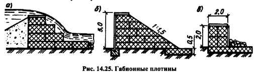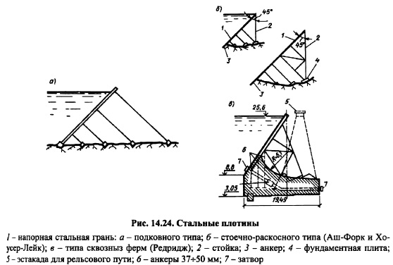 СТАЛЬНЫЕ И ГАБИОННЫЕ ПЛОТИНЫВ последние 20 лет XX в. несколько стальных плотин было построено в Австралии. В стальных плотинах, которые по существу являются контрфорсными, наклонная напорная грань выполнена из стали, а контрфорсы или сквозные фермы, являющиеся опорными конструкциями, выполняются, как из стали, так и из железобетона. Примерами построенных и эксплуатируемых достаточно большой период времени стальных плотин могут служить головная плотина Караязской оросительной системы на реке Куре, плотины АшФорк, Хаусер-Лейк и Редридж. Опорные конструкции стальных плотин могут быть: подкосного типа (рис. 14.24, а) стоечнораскосного типа (рис. 14.24, б); типа сквозных ферм (рис. 14.24, в). Контрфорсы или сквозные фермы заанкериваются в фундаментную плиту или непосредственно в скальное основание. Между собой они, как правило, соединяются попарно или по тричетыре, составляя своего рода пространственные конструкции, которые соединяются напорными перекрытиями. Напорные перекрытия из стали выполняются аналогично обшивке стальных затворов. Устойчивость плотины в целом обеспечивается за счет, главным образом, пригрузки воды на наклонную напорную грань, а также заделкой опор в фундаментную плиту или скальное основание. ![]() Стальные перекрытия между контрфорсами, выполненными из бетона или железобетона, могут быть выполнены в виде гибких оболочек (обратных арок), работающих только на растяжение. Такое напорное перекрытие менее чувствительно к колебаниям температур, легко монтируется и проще в эксплуатации. Достаточно длительный опыт эксплуатации стальных плотин по данным М.М. Гришина позволил выявить как их преимущества, так и недостатки. К достоинствам плотин можно отнести: наиболее полное использование механических свойств материала, быстрота возведения за счет возможности укрупненной сборки элементов плотины в заводских условиях и возможности производства работ практически при любых погодных условиях, относительно невысокая стоимость плотины. К недостаткам же стальных плотин можно отнести: необходимость проведения дополнительных работ по защите стали от коррозии и большой расход металла, стоимость которого в последние годы постоянно растет. Данные недостатки не способствовали строительству данного типа плотин за последние десятилетия. Габионные плотины представляют собой кладку из сетчатых ящиков (габионов), которые заполняются каменным материалом. Ящики изготавливаются из высокопрочной проволоки со специальным антикоррозийным покрытием и конструкция их такова, что позволяет полностью использовать прочностные свойства металла. Фирмы выпускающие габионные конструкции гарантируют безопасную и надежную их работу до 50 лет. Этот тип плотин в последнее время получил широкое распространение за рубежом при строительстве плотин высотой 10-12 м. на горных реках. ![]() В зависимости от того, как устроена кладка габионов, такие плотины бывают: многоступенчатого (рис. 14.25, а), трапецеидального (рис. 14.25, б) и прямоугольного (рис, 14.25, в) профилей. Чаще всего такие плотины строятся водосливными. Размеры габионов формирующих тело водосливной плотины и её водобойную часть принимаются. Надежность габионных плотин может быть повышена устройством сверху асфальтобетонных покрытий. |