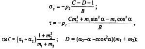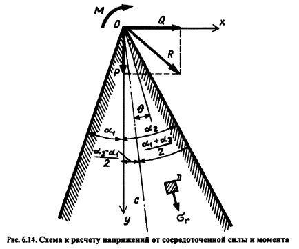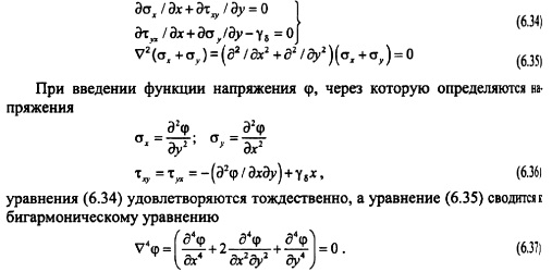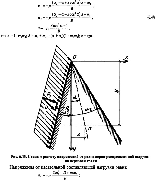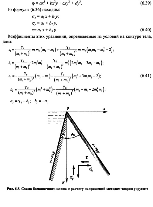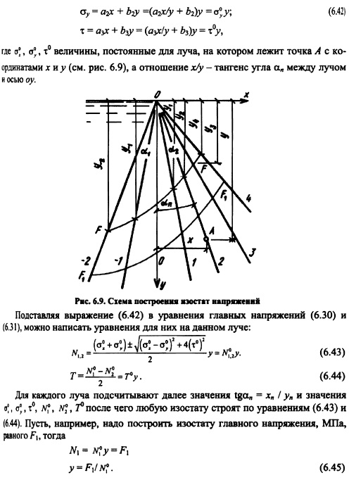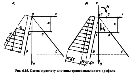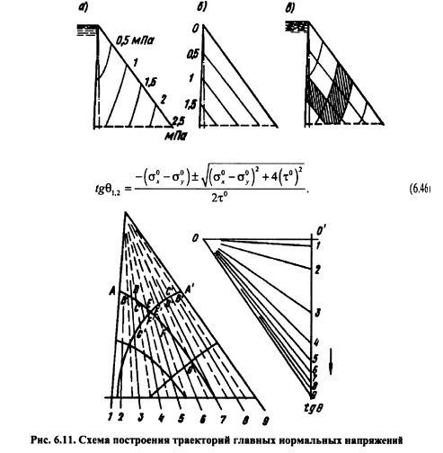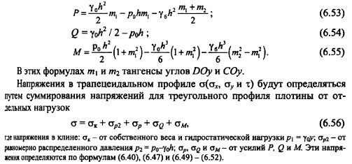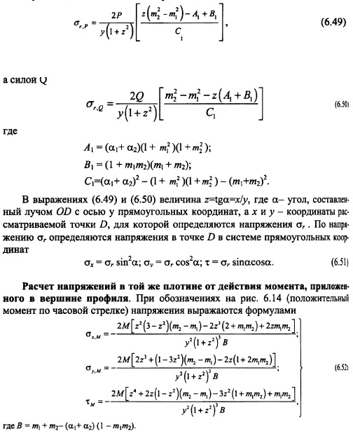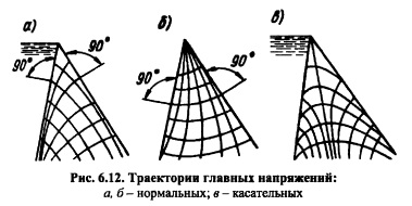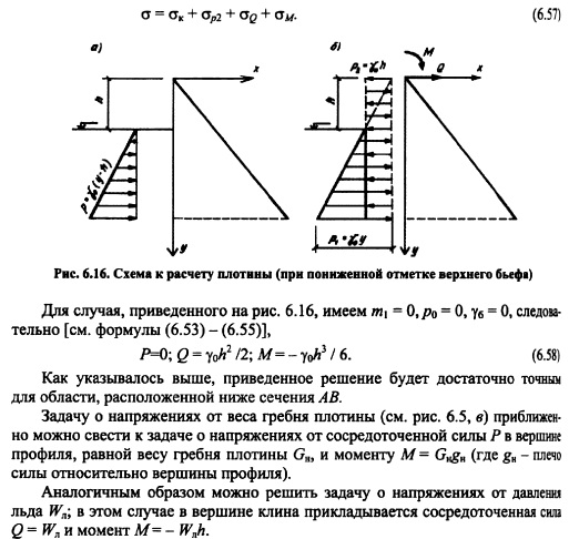 РАСЧЕТ НАПРЯЖЕНИЙ В ГРАВИТАЦИОННЫХ ПЛОТИНАХ МЕТОДОМ ТЕОРИИ УПРУГОСТИОсновные положения. При расчете гравитационных плотин рассматривают плоскую задачу теории упругости. Данная задача в том случае, когда объемной силой является сила тяжести уб =ps g описывается следующими уравнениями [201]: ![]() Таким образом, решение плоской задачи теории упругости в данной постановке заключается в нахождении функции напряжений ср, удовлетворяющей бигармоническому уравнению (6.37) и заданным уравнениям на контуре тела ![]() В ряде случаев решение задач удобно выполнять в полярных координатах; соответствующие выражения, аналогичные приведенным выше, изложены в курсах теории упругости. Расчет напряжений в плотине от гидростатического давления и собственного веса Плотина представляется в виде бесконечного клина, загруженного собственным весом и гидростатическим давлением, при уровне воды на отметке вершины клина (рис. 6.8). Для данного случая загружения функция напряжения принимается в виде: ![]() Коэффициенты этих уравнений, определяемые из условий на контуре тела, равны: Если плотина не нагружена водой (строительный случай или опорожненное водохранилище), напряжения определяют по тем же уравнениям, но в ни надо подставит уо = 0, вследствие чего вторые члены выражений (6.41) отпадут. По полученным значениям напряжений аоитв заданных точках внутри профиля плотины главные напряжения определяют по формулам (6.30) и (6.31), а направление их действия по формулам (6.32) или (6.33). Изостату любого напряжения ст, оу и т строят по уравнениям напряжений (6.40) и (6.41). Для этого следует задать постоянное значение напряжения, например cr=const, и по уравнению для различных значений координаты х или у находить соответствующую другую координату той же точки. Для упрощения построения кривых можно пользоваться следующим приемом. Из вершины треугольного профиля плотины проводят ряд лучей, считал за нулевой луч ось оу (рис. 6.9) и нумеруя их по порядку со знаком «+» направо от этой оси и со знаком «» налево. ![]() Подставляя в уравнение (6.45) значения для каждого луча, получают координату соответствующей точки заданной изостаты; соединяя эти точки от луча к лучу, строят кривую изостаты главного нормального напряжения (см. рис. 6.9). Давая другое значение N\, например F2, строят аналогичным путем кривую N= Fj Обычно изостаты напряжений строят для значений напряжений 0,5; 1,0; 1,5 МПа (5; 10; 15 кгс/см2) и т. д. На рис. 6.10 приведены изостаты главных нормальных напряжений в плотине при наполненном (рис. 6.10, а) и опорожненном (рис. 6.10, б) водохранилище. Если совместить кривые первого и второго случаев на одном чертеже (рис. 6.10, в), то легко можно выделить зоны плотины, которые могут иметь напряжения в заданных пределах. Например, на рис. 6.10, в заштрихована зона с главными сжимающими напряжениями в пределах 1,5 МПа. ![]() Кривыми изостат главных нормальных напряжений можно пользоваться для назначения в разных зонах плотины бетона соответствующей прочности. Траектории напряжений. Положение площадок действия или направлений главных нормальных напряжений определяется углом наклона 0 этих площадок к оси Ох согласно уравнению (6.32). При этом значения tg0 вычисляют аналогично тому, как это делается для изостат главных напряжений, а именно: в выражение (6.32) подставляют значения стх, ау и т из уравнений (6.42). В результате получают фо