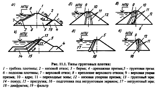 ТИПЫ ГРУНТОВЫХ ПЛОТИНГрунтовые плотины самый древний тип искусственных подпорных ссч оружений. В Египте, Индии, Перу и других странах простейшие грунтовые плотины строились за несколько тысяч лет до нашей эры. В России в документах XIII в. о грунтовых плотинах упоминается как об обычных распространенных сооружениях. Существующая и поныне Змеиногорская плотина высотой 18 м, построенная в 1780 г. К.Д. Фроловым, говорит о совершенстве строительства подобных сооружений в XVIII в. В XIX в. в качестве материала для тела плотин применяли не только мелкозернистые грунты, но и предварительно разрыхленный взрывным способом скальный грунт. Высота грунтовых плотин достигала 50 м. В XX в. грунтовые плотины получили наибольшее распространение, особенно в 5060х годах. Высота некоторых плотин достигла в настоящее время 300 м, объемы грунта 130 млн м3. Грунтовые плотины наиболее распространенный тип плотин, что объясняется возможностью полной механизации технологического процесса по возведению плотины от разработки грунта в карьере до укладки его в тело плотины, широким разнообразием конструкций плотин, которые позволяют использовать для тела плотины практически любые грунты, находящиеся вблизи створа. Кроме того, при возведении грунтовых плотин предъявляются меньшие требования к деформируемости основания, чем плотин других типов. Их строят даже на очень слабых илистых основаниях. Грунтовые плотины по используемым материалам классифицируют на земляные, в которых основной объем тела плотины (более 50%) выполняется из мелкозернистых глинистых, песчаных или песчаногравелистых грунтов; каменноземляные, в которых основной объем тела плотины выполняется из крупнозернистых гравийногалечниковых грунтов или горной массы скального (иногда полускального) грунта, а противофильтрационное устройство из мелкозернистого грунта; каменные, в которых основное тело плотины, как и у каменноземляных плотин, выполняется из крупнозернистого материала, а противофильтрационное устройство (если оно требуется) из негрунтовых материалов. Все эти плотины имеют трапециевидное поперечное сечение с прямолинейным или ломаным очертанием верхового и низового откосов. Тангенс угла наклона откоса к горизонту называется уклоном откоса tga=l:m, а m=ctg a коэффициентом заложения откоса или просто заложением откоса. Самая верхняя кромка откоса называется его бровкой, а нижняя подошвой откоса. Горизонтальные или слабонаклонные участки поверхности откосов называют бермами. По конструкции плотины делят на однородные (рис. 11.1, а), возводимые без специальных противофильтрационных элементов и неоднородные (рис. 11.1. бе), тело которых состоит из грунтов двух или нескольких видов. Неоднородные плотины по расположению противофилырационного грунтового устройства в свою очередь делятся на плотины: с центральным ядром (рис. 11.1, 6), когда противофилырационное устройство из мелкозернистого грунта располагается строго по оси плотины; с наклонным ядром (рис. 11.1, в), когда низовая грань противофилырационного устройства наклонена к горизонту под острым углом р, но угол наклона Р больше угла естественного откоса крупнозернистого фунта; с экраном, когда угол Р меньше или равен углу естественного откоса крупнозернистого фунта (рис. 11.1, г). ![]() Если протнвофильтрационное устройство выполняется из нег