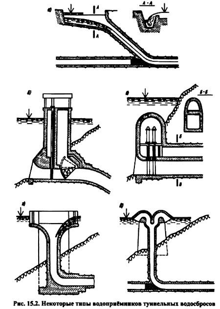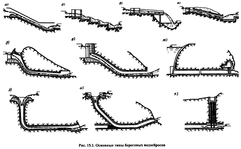 УСЛОВИЯ ПРИМЕНЕНИЯ И ТИПЫ БЕРЕГОВЫХ ВОДОСБРОСОВОсновные понятия. Береговыми называются водосбросы, располагающиеся вне тела плотины, на берегах. Береговой водосброс любого типа, как правило, состоит из следующих частей: головной или водоприемника, сбросной и концевой. Водоприемник обеспечивает подачу воды в водосброс и представляет собой поверхностное, глубинное или донное отверстие с направляющими стенками и оголовком. Он может располагаться как на берегу, так и в береговых частях плотин, входя в напорный фронт гидроузла (рис. 15.5). В пределах сбросной части водный поток преодолевает разность отметок бьефов. Концевая часть водосброса обеспечивает сопряжение с нижним бьефом. При необходимости для подвода потока к водосбросу и его отвода в русло выполняются каналы. Условия применения береговых водосбросов. Береговые водосбросы применяются, как правило, в следующих случаях: а) в составе низконапорных гидроузлов с грунтовой плотиной при небольших сбрасываемых расходах и благоприятных топографических условиях;б) на гидроузлах среднего и высокого напора с грунтовыми плотинами, когда размещение водосброса в теле плотины невозможно или нецелесообразно по условиям надежности или из-за конструктивных трудностей; в) на гидроузлах в узких створах, где стеснен фронт строительных работ или недостаточен водосливной фронт (например, из-за размещения за плотиной здания гидроэлектростанции); г) при пропуске строительных расходов через обходные тоннели, которые могут быть Частично или полностью использованы в эксплуатационный период. На низконапорных гидроузлах иногда возможно использовать для полного или частичного пропуска паводковых расходов пойму реки, являющуюся в этом случае естественным береговым водосбросом. Классификация и типы береговых водосбросов. В дополнение к общей классификации водопропускных сооружений, данной в главе 4, можно добавить следующее. По основному конструктивному признаку береговые водосбросы можно разделить на открытые (с незамкнутым поперечным сечением), закрытые (с замкнутым поперечным сечением) и комбинированные ( с чередующимися открытыми и закрытыми участками). Основными признаками, определяющими тип берегового водосброса, являются гидравлические и конструктивные особенности его сбросной части (рис. 15.1). В этой связи можно выделить следующие основные типы береговых водосбросов: водосбросные каналы с преодолением разности уровней бьефов быстротоком (рис. 15.1, а), ступенчатым (рис. 15.1, б) и консольным (рис. 15.1, в) перепадами; трубчатые поверхностные водосбросы со сбросной частью в виде труб, уложенных в грунтовую выемку с их полной или частичной засыпкой Некоторые возможные варианты конструкций головных частей (водоприемников) показаны на рис. 15.1. Помимо этого возможны конструкции в виде траншейного водослива (рис. 15.2, а), башенного (рис. 15.2, б) или безбашенного глубинного (рис. 15.2, в) водоприемников, поверхностного башенного водоприемника, например, в виде башни с кольцевым водосливом (рис. 15.2, г) или сифоном (рис. 15.2, д). Используются водоприемники и других конструкций, например, в виде спиральной камеры в случае шахтного водосброса. Такая конструкция за счет закрутки потока обеспечивает устойчивый гидравлический режим в вертикальной шахте и называется вихревым шахтным водосбросом. В посл