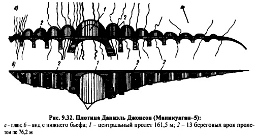 УСЛОВИЯ ПРИМЕНЕНИЯ РАЗЛИЧНЫХ ТИПОВ КОНТРФОРСНЫХ ПЛОТИН И ПУТИ ИХ ДАЛЬНЕЙШЕГО РАЗВИТИЯУсловия применения плотин различных типов. Контрфорсные бетонные плотины могут строиться в различных створах, но в относительно узких створах они уступают по экономичности арочным плотинам. В широких створах у контрфорсных плотин нет конкурентов, кроме грунтовых плотин (см. гл. 1113), особенно при высоких напорах. Самая высокая многоарочная плотина Даниель Джонсон (она же Маникуаган5) имеет максимальную высоту 215 м и длину 1220 м (рис. 9.32); она состоит из 13 секций пролетами арок по 76,2 м и центральной арки пролетом 161,5 м; основание ее граниты. ![]() В плане ось плотины может быть прямой или ломаной в зависимости от геологических и других условий (плотины Розелан, Андижанская); криволинейны в плане плотины Бартлетт, Клайвдог. Последняя плотина высотой 72,4 м построена в створе, очень удобном для арочной плотины, но геологические условия (слабые сланцы) заставили отказаться от нее. Кривизна плотины в плане выпуклостью в нижний бьеф вызвана положением более плотных пород (полоса песчаника), а также условиями сброса паводка водосливами (без затворов) в береговые лотки ступенчатого типа, расположенные на обоих берегах у подножья контрфорсов. Основания для контрфорсных плотин, как правило, скальные, но могут быть н прочные нескальные, полу скальные. В последнем случае ограничивается высота плотины (до 3050 м) и в конструкцию плотины вводятся фундаментная плита, балки или ребра жесткости и др. Для многоарочных плотин желательны наиболее прочные основания. Контрфорсные плотины можно строить в разнообразных климатических условиях и на высоких отметках над уровнем моря в горах, но в суровых условиях севера целесообразно возводить теплоизолирующую стенку между контрфорсами со стороны нижнего бьефа для создания благоприятного теплового режима. Могут устанавливаться калориферы для поддержания положительных температур между контрфорсами (плотина Зейской ГЭС). Наиболее экономичными по затратам по сравнению с гравитационными являются многоарочные бетонные плотины. Плотины с плоскими перекрытиями могли бы конкурировать с ними лишь при напорах до 30-40 м, но они требуют затрат стальной арматуры (до 4050 кг/м3), поэтому в последнее время их почти не строят. Массивноконтрфорсные плотины требуют бетона несколько больше, чем бетонные многоарочные, но последние сложнее в производстве работ и поэтому затраты на те или другие могут мало отличаться. В каждом конкретном случае вопрос решается сравнением проектных вариантов плотины и учетом местных условий. Недостатками контрфорсных плотин по сравнению с гравитационными являются: 1) большая сложность производства работ по их возведению, в частности, пропуска речных вод через строящуюся плотину, особенно на многоводных реках;2) необходимость специальных мер по обеспечению сейсмостойкости плотин (исключение составляют массивноконтрфорсные плотины); 3) в многоарочных плотинах чувствительность статически неопределимых перекрытий к колебаниям внешней температуры и к осадкам контрфорсов, осложнения при устройстве эксплуатационных водосбросов. Пути дальнейшего развития контрфорсных плотин. При проектировании массивноконтрфорсных плотин основной задачей является борьба с тре щинообразованием в бетоне от экзотермии, 