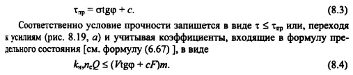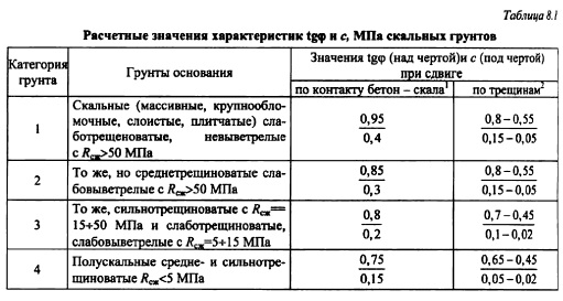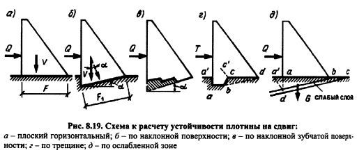 УСТОЙЧИВОСТЬ ПЛОТИН И ПРОЧНОСТЬ ИХ СКАЛЬНЫХ ОСНОВАНИЙНарушение устойчивости плотины и ее смещение могут произойти вследствие: сдвига сооружения при нарушении контакта его с основанием или по трещинам или ослабленным зонам основания; разрушения скального массива основания под действием развивающихся в нем напряжений. Устойчивость плотины против сдвига. Сдвиг плотины по скальному основанию может произойти в случае нарушения сдвиговой прочности контакта ее с основанием, которая описывается теорией прочности Кулона-Мора, ![]() Соответственно условие прочности запишется переходя к усилиям (рис. 8.19, а) и учитывая коэффициенты, входящие в формулу предельного состояния [см. формулу (6.67) ], в виде Расчетные значения параметров сдвиговой прочности скального основания tg(p и с определяют для оснований сооружений I и П классов по результатам полевых или лабораторных испытаний, проводимых методом сдвига бетонных штампов или скальных целиков. Для оснований сооружений Ш и IV классов, а также для сооружений всех классов на стадии техникоэкономического обоснования строительства нормами (СНиП 2.02.0285) рекомендуются расчетные значения tgip и с, основанные на обобщении данных полевых опытов (табл. 8.1). Если плоскость сдвига наклонена под углом а к горизонту (рис. 8.19,6), то формула (8.4) примет вид: ![]() Этой же формулой можно пользоваться в случае устройства зубчатой поверхности основания с наклоном зубьев под углом а к горизонту. В этом случае экономится часть бетона в плотине и часть скальной выемки (на рис. 8.19, в заштриховано). Применение наклона подошвы плотины в сторону верхнего бьефа повышает устойчивость плотины на сдвиг, что видно из формулы (8.5). Повышение сопротивления сдвигу плотины достигается также использованием естественных скальных упоров со стороны нижнего бьефа при заглублении подошвы плотины в скалу или специальных бетонных массивов, в которые упирается плотина, или сопротивления здания ГЭС, непосредственно примыкающего к плотине, как это сделано, например, у Красноярской плотины (см. рис. 8.3, г). ![]() По формуле (8.5) можно определить, возможна ли потеря устойчивости плотины при сдвиге по трещинам в скале основания и по ослабленным слоям слоистого основания. Например, по косой трещине в основании или слабом слое может произойти сдвиг по слабому слою (линия dc на рис. 8.19, д); в том случае, если имеются (или могут образоваться) трещины abd (см. рис. 8.19, г) также возможен сдвиг по ним. В этом случае в расчетах по формуле (8.5) в состав силы V надо включить вес G скалы в объеме bed (или adc), а силу Q увеличить за счет фильтрационного давления на участок скалы ad. ![]() При расчетах сдвига внутри скального основания необходимо проанализировать все возможные опасные трещины. В этом случае при расчетах по формуле (8.5) можно пользоваться данными табл. 8.1, если нет опытных данных или аналогов. В случае значительной ширины раскрытия трещины и рыхлого заполнителя трещины необходимо брать tg