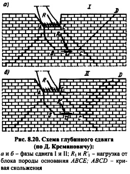 В скальных основаниях иногда могут иметь место глубинный сдвиг, аналогичный такому же сдвигу в нескальных основаниях (см. п. 7.6), и смешанный сдвиг частично по контакту плотны с основанием, частично внутри массива основания, иногда по ломаным поверхностям скольжения. Такого рода сдвиги могут быть в раздробленных, мелкоблочных основаниях, а иногда и в сложных слабых и полускальных основаниях. На рис. 8.20 приведен пример глубинного сдвига (по модельным исследованиям Д. Крсмановича) в блочном основании: вверху первый этап а и б фазы сдвига грузка от развития трещин В глубину, внизу КО блока породы основания, образование «призмы скольжения пнрания». Прочность скального основания. Хотя скальные породы, как правило, более прочны «в куске», чем бетон, но в массиве, ослабленном многочисленными трещинами, основание может оказаться слабее бетона и в нем возникнут деформации, существенно большие, чем в бетоне (модуль деформации основания может падать до 23 ГПа, модуль упругости бетона доходит до 2025 ГПа). Прочность кусков скальной породы на раздробление, как правило, выше прочности бетона. Однако в областях возможных растягивающих напряжений могут образоваться трещины или раскрыться имеющиеся. Эти области основания находятся со стороны верхнего бьефа, в зоне цементационной завесы (что поведет к усиленной фильтрации под плотиной). Эти области обнаруживаются при расчете напряженного состояния комплекса «плотинаоснование»; в этом случае должна быть проведена цементация основания. Деформация плотин и их оснований. Вследствие большой жесткости скальных оснований плотин их вертикальные (осадки) и горизонтальные смещения невелики, измеряются миллиметрами, поэтому расчеты плотин и оснований по второму предельному состоянию проводятся (и то не всегда) для сооружений 1 класса, для неразрезных конструкций плотин в случае очень податливых оснований. Этот расчет нужен также при наличии резко отличных (по деформативности) пород в основании. Допустимые величины смещений устанавливают в каждом отдельном случае по соображениям эксплуатации плотины и соседних сооружений гидроузла. |
