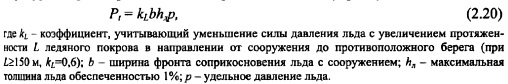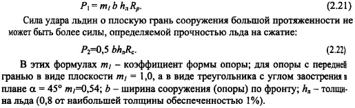 Сила удара льдин о плоскую грань сооружения большой протяженности не может быть более силы, определяемой прочностью льда на сжатие: В этих формулах коэффициент формы опоры; для опоры с передней гранью в виде плоскости т = 1,0, а в виде треугольника с углом заострения в плане а = 45° т/=0,54; ширина сооружения (опоры) по фронту; hn толщина льда (0,8 от наибольшей толщины обеспеченностью 1%). |
