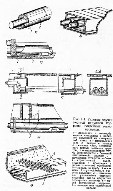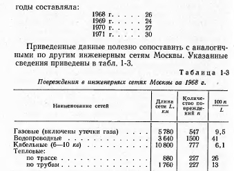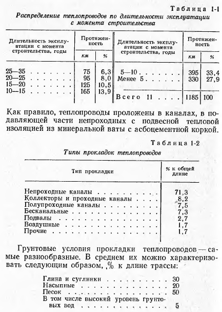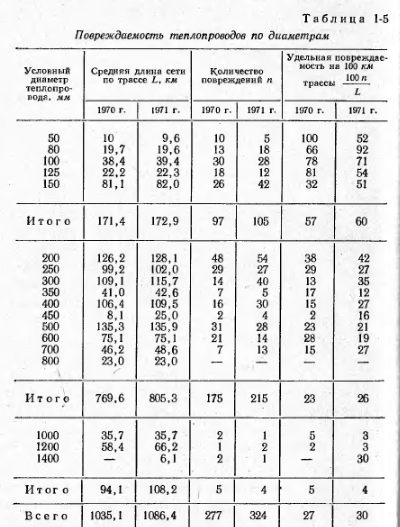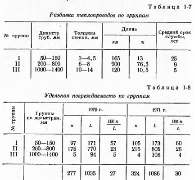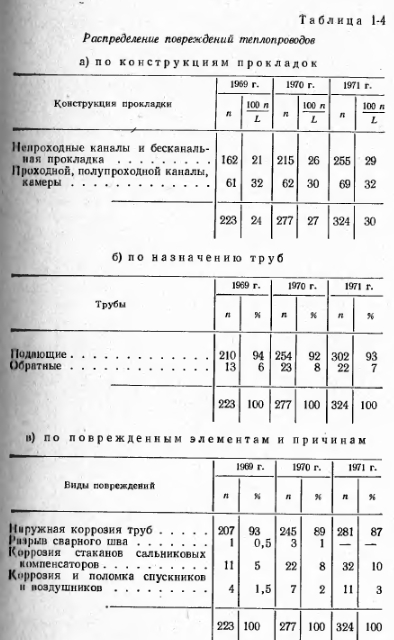АНАЛИЗ ПОВРЕЖДЕНИЙ В ТЕПЛОВЫХ СЕТЯХПо современной терминологии все вопросы качества изделия или снабжения включаются в понятие «надежность», под которым (ГОСТ 13377-67) понимается свойство изделия (или системы) выполнять заданные функции, сохраняя свои эксплуатационные показатели в заданных пределах в течение требуемого промежутка времени. Ввиду большого разнообразия присоединяемых к тепловым сетям потребителей в настоящее время требуется, как правило, круглосуточная подача тепла в течение круглого года. Всякие, даже кратковременные, перерывы в подаче тепла в той или иной степени нарушают интересы потребителей. Особенно это относится к системам горячего водоснабжения (весь год) и системам вентиляции (отопительный сезон). Таким образом, бесперебойная подача тепла потребителям является одним из основных показателей надежности. Всякое повреждение (отказ) теплопровода, при отсутствии резервного питания, ведет к отключению одного или нескольких потребителей и, следовательно, нарушает бесперебойность их теплоснабжения. Таким образом, количество возникающих повреждений (отказов) характеризует степень бесперебойности и, следовательно, надежность теплоснабжения: чем больше повреждений, тем меньше степень надежности. Надежность снабжения каждого данного потребителя (или узла сети для группы потребителей) определяется, исходя из надежности всех отдельных элементов, составляющих путь снабжения его теплом. В свою очередь надежность каждого элемента равна вероятности его безотказной работы за принятый период времени; ниже мы вернемся к этому вопросу. Теплопроводы в городах прокладываются, как правило, под землей. Условия работы подземного теплопровода в значительной мере отличаются от других инженерных сетей. Все теплопроводы в силу наличия горячей поды переменной температуры связаны с постоянными перемещениями вдоль оси и испытывают температурные наряжения. Подающий теплопровод большую часть года работает с температурой, считающейся наиболее опасной по коррозионным условиям (70—85 °С). Условия прокладки в черте городской застройки весьма тяжелы, гик как характеризуются быстрой сменой грунтов, необходимостью пересечения смежных подземных сооружений, а иногда и зданий. Прямолинейность трассы обычно по может быть соблюдена. В этих условиях не приходится удивляться той сравнительно высокой повреждаемости, которую имеют городские тепловые сети. Следует оказать, что повреждаемость тепловых сетей особенно амстна потому, что в отличие от других городских коммуникаций— водопровод, газ, электроэнергия — тепловые сети в городах прокладываются радиальными, тупиковыми и не имеют резервных связей. По терминологии, принятой в сетях электрических, они относятся к категории сетей разомкнутых. Теплопроводы в городах СССР существуют около 50 л г и, хотя их интенсивное строительство началось лишь в последние 15—20 лет, все же за это время в организациях накоплен большой опыт их проектирования, строительства и эксплуатации. Однако систематизация, изучение и обобщение этого опыта производятся явно недостаточно. Главным источником такого изучения и обобщения должен был бы являться систематический учет всех повреждений, выявленных во время эксплуатации и ремонтов на теплопроводах. Нужна регистрация именно всех повреждений, а