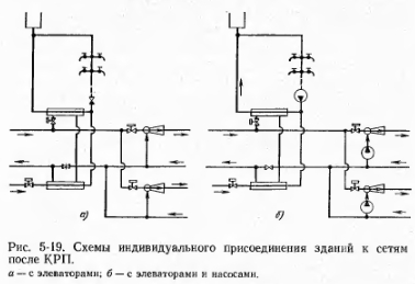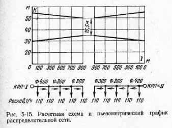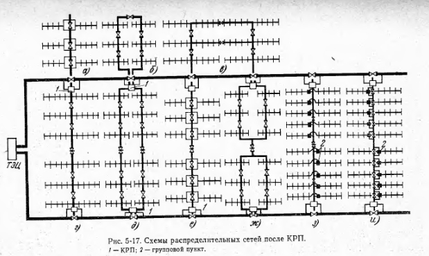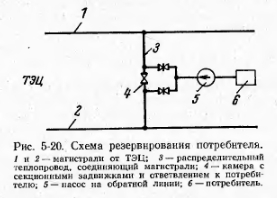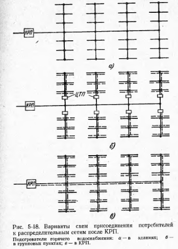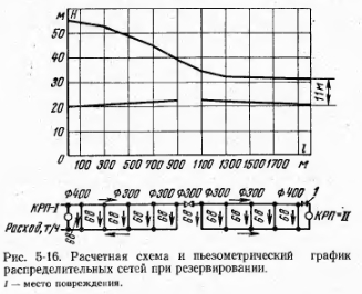 РАСПРЕДЕЛИТЕЛЬНЫЕ СЕТИ И СХЕМЫ ПРИСОЕДИНЕНИЯ ПОТРЕБИТЕЛЕЙБольшое значение для надежного теплоснабжения потребителей имеют и распределительные сети. У них более мелкие диаметры, чем у магистральных, и, следовательно, они прокладываются из более тонкостенных труб. Так как скорость местной почвенной коррозии труб в каналах не зависит от их диаметра, то возможный срок сквозных повреждений для распределительных сетей наступает значительно раньше, чем для магистральных. Статистика повреждаемости трубопроводов (см. гл. 1) подтверждает это положение — чем меньше диаметр труб и, следовательно, тоньше стенка трубы, тем выше повреждаемость. В современных сетях распределительные теплопроводы, как правило, работают с теми же параметрами, что и сети магистральные. При наличии районных КРП режим давлений в разводящих сетях может быть значительно облегчен, температурный режим в нормальном режиме сохранится. Однако в современных сетях ответвления от магистралей для подключения распределительных сетей делаются обычно чаще, чем через 1 км, как это предусматривается при районных КРП. Таким образом, селективность возможных отключений распределительных сетей при повреждениях на них снижается. Чтобы не допустить снижения надежности, можно применить секционированные или кольцевые схемы. Наилучшие возможности для резервирования распределительных сетей создаются при расположении их между магистралями. В этих случаях сравнительно незначительное удорожание сетей позволяет значительно повысить их надежность. Необходимо остановиться на самом принципе резервирования в распределительных сетях. Размеры тепловой нагрузки и количество потребителей здесь несоизмеримы с сетями магистральными. И, что особенно важно, разводящие сети после районных КРП гидравлически значительно устойчивее, так как потери давления в них значительно меньше, чем активный перепад давлений у потребителей. Из этого можно сделать вывод о том, что при резервировании в таких сетях нет оснований добиваться сохранения 100%-ного расхода сетевой воды. Во-первых, само распределение расхода сетевой воды при его сокращении будет значительно более равномерным, чем в сети магистральной, во-вторых, вполне возможно прибегнуть к местной ручной подрегулировке на вводах потребителей, включая временное на период ликвидации повреждения отключение установок горячего водоснабжения. Кроме того, возможно на это время несколько увеличить перепад давлений после КРП. Переключение нагрузки одного КРП с одной магистрали на другую, параллельную, может увеличить нагрузку магистрали лишь незначительно и, как правило, не вызовет необходимости повышения температуры подаваемой воды. На рис. 5-15 показаны примерная расчетная схема и пьезометрический график в разводящих сетях без резервирования. Перепад давлений после КРП принят 25 ж и у конечного потребителя — 15,5 м. Диаметр теплопровода на головном участке определен 400 мм при радиусе действия сети 900 м и расходе сетевой воды 14 г на 1 Гкал/ч. Материальная характеристика сетей от ![]() При соединении однотрубной перемычкой двух смежных разводящих сетей и расчете сети на случай повреждения в подающем теплопроводе на 70% расхода воды (рис. 5-16) материальная характеристика сети возрастает всего на 10%. Так как перемычки на разводящих сетях могут испо