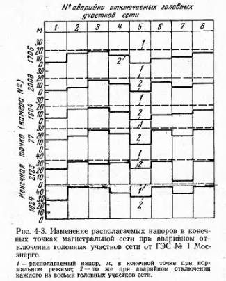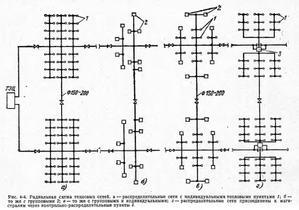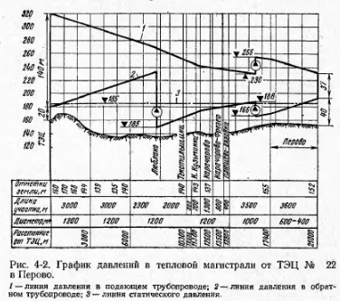 ХЕМЫ СОВРЕМЕННЫХ СЕТЕЙКак в первые годы развития, так и до последнего времени по традиции, узаконенной действующими нормами проектирования, тепловые сети в городах прокладывались по радиальной схеме. Перемычки между магистралями в действующих сетях возникали в значительной мере случайно, для чего использовались идущие в нужном направлении распределительные сети. При постепенной теплофикации отдельных кварталов в старых городах количество таких перемычек становилось весьма значительным. Наглядным образцом такого возникновения многокольцевой сети является показанная на рис. 4-1 схема тепловых сетей одной ТЭЦ Мосэнерго. В таких сетях нет сколько-нибудь резкой границы между магистральными и распределительными сетями. Они могут разделяться лишь по диаметрам трубопроводов. Как те, так и другие работают с одним и тем же тепловым и гидравлическим режимом. Разница в давлениях теплоносителя больше зависит от расстояния данного участка от ТЭЦ, чем от его принадлежности к магистральной или распределительной сети. Одинаковые параметры теплоносителя в сетях объективно приводят к большому количеству ответвлений на тепловых магистралях и даже к присоединению к ним близко расположенных отдельных потребителей. В результате тепловая сеть становится очень разветвленной, с большим количеством отдельных самостоятельных потребителей. Еще 10—15 лет назад тепловые нагрузки магистралей, отходящих от ТЭЦ, редко превышали 100—150 Гкал/ч, диаметр их 500—600 мм и радиус действия 2,5—3,0 км. В такой сравнительно короткой сети разность напоров на выводах ТЭЦ обычно не превышала 50—60 м, а максимальное давление в подающих трубах 7—8 кгс/см2, в обратных 3,5—4,5 кгс/см2. Прошедшие годы резко изменили характер систем городов. Вместе с внедрением в энергетику мощных теплофикационных турбин и крупных ТЭЦ значительно возросли радиусы действия тепловых сетей, диаметры магистральных теплопроводов, их тепловые нагрузки. ![]() Рост радиусов действия и тепловых нагрузок наглядно виден, например, из табл. 4-1, в которой приведена группировка по радиусам и нагрузкам водяных магистралей, отходящих от коллекторов Московских ТЭЦ. Из 40 магистралей третья часть имеет радиус действия более 6 км, а шестая часть — более 10 км. Если же учесть их проектную нагрузку, то в первом случае она составит около 65% от суммарной, а во втором — около 40%. К этому следует добавить, что последние годы сооружались только магистрали большого радиуса действия. ![]() Увеличение радиуса действия магистралей естественно привело к повышению располагаемых напоров на ТЭЦ, к появлению насосно-перекачивающих станций. Так на Московских ТЭЦ средний располагаемый напор возрос до 10 кгс/см2, в тепловых сетях сооружено более 20 насосно-перекачивающих станций с установленной мощностью насосных агрегатов около 50 тыс. кет. На рис. 4-2 приведен в качестве примера график давления в протяженной тепловой магистрали от ТЭЦ № 22. Во многих случаях к сетям присоединены теперь потребители, перерыв в теплоснабжении которых совершенно недопустим — медицинские учреждения со стационарами, парниковые хозяйства и др. С другой стороны, значительно увеличилось количество потребителей С резко переменной нагрузкой — научно-исследовательские институты, опытные производства, работающие в 1—1,5 смены, и пр. Вместе с ростом радиус