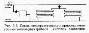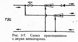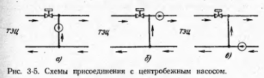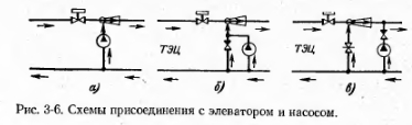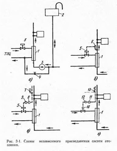 СХЕМЫ ПРИСОЕДИНЕНИЯ СИСТЕМ ОТОПЛЕНИЯТепловые пункты потребителей служат для распределения и контроля теплоносителя, трансформации его температуры и давления и, таким образом, являются связующим звеном между наружной тепловой сетью и системами потребителя. По технологической сущности тепловые пункты следовало бы называть контрольно-распределительными. Сложность и состав оборудования теплового пункта определяются в основном схемой присоединения данной местной системы (отопления, приточной вентиляции и горячего водоснабжения) к тепловой сети. Выбор схемы присоединения должен всегда определяться как технологическими особенностями данной местной системы, так и требованиями наружной тепловой сети. Следует всегда учитывать, от какой тепловой сети получает тепло потребитель. В максимальной степени это относится к наиболее распространенному виду потребителя тепла — системам отопления. Обычно схемы присоединения отопительных систем делятся: 1) по признаку гидравлической зависимости на схемы независимые и схемы зависимые; 2) по признаку наличия смесительных устройств (только для зависимых схем) на схемы без смешения и схемы со смешением. При независимых схемах присоединения гидравлическая изоляция местной отопительной системы от наружной тепловой сети позволяет обеспечить работу местной системы под гидростатическим давлением собственного расширительного бака. Это избавляет систему как от повышенных давлений в наружной Тепловой сети, так и от неизбежных колебаний давления в ней, защищает ее от аварийных повышений давления в наружной сети. Такая гидравлическая изоляция особенно полезна при подключении • систем отопления, проработавших многие годы от местных котельных. В таких системах могут быть и ненадежные чугунные нагревательные приборы, чугунные трубы и трубы, заделанные в панели и стены. Такие же схемы присоединения находят применение в зданиях, где даже случайные и небольшие повреждения могут привести к катастрофическим последствиям (музеи, архивы и пр.), а также в тех частях тепловой сети, где давление в обратной линии превышает допустимое рабочее давление для местной отопительной системы с чугунными радиаторами 6 кгс/сдр, для стальных конвекторов 9—10 кгс/см2. Независимые схемы присоединения предпочтительны также в сетях с непосредственным водоразбором, поскольку отделяют от сети наиболее вероятный источник загрязнения сетевой воды. Гидравлическая изоляция отопительной системы от наружной тепловой сети обычно выполняется с помощью водоводяного подогревателя 1 (рис. 3-1). Система отопления должна работать с собственным расширительным сосудом 2 (рис. 3-1, о). Подпитка системы может производиться очищенной и деаэрированной водой из тепловой сети периодически путем открытия вручную крана 4 на перемычке, соединяющей обратную линию наружной сети и местной системы. Возможна подпитка из системы горячего водоснабжения. Для автоматизации подпитки на расширительном баке устанавливаются два реле уровня таким образом, чтобы контакт верхнего реле уровня замыкался при полном наполнении бака, а контакт нижнего реле — при допустимом низком уровне воды в баке. Контакты верхнего и нижнего реле служат для подачи импульсов на соленоидный вентиль, устанавливаемый на линии подпитки. В случае недостаточности давл