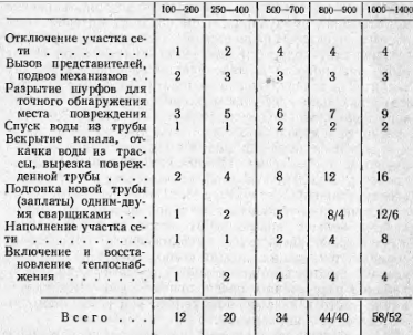СИСТЕМА ОБСЛУЖИВАНИЯТепловые сети крупных городов в настоящее время, как правило, представляют сложные инженерные комплексы, требующие хорошо продуманной и строго выполняемой системы обслуживания. В этот комплекс обычно входят подземные теплопроводы с камерами для установки оборудования, сопутствующие дренажи с колодцами и дренажными станциями, насосно-перекачивающие станции и, наконец, устройства связи и телемеханики. Общий принцип организации обслуживания таких комплексов заключается в создании территориальных ячеек в виде сетевых районов и центральных служб — диспетчерской, электрохозяйства, автоматики и телемеханики, механизации, ремонтов и пр. Сетевые районы должны быть способными выполнять основные работы по обслуживанию и текущему ремонту сетей, персонал в них разбивается на участки. Целесообразно, чтобы каждый район объединял эксплуатацию всех сетей какой-либо одной (двух) ТЭЦ, а каждый участок района обслуживал все сети одного или нескольких направлений (магистралей) от ТЭЦ. При таком разделении сетей наиболее просто осуществляется контроль за основными оперативными и технико-экономическими показателями работы сетей — часовой и месячной добавкой подпиточной воды в сеть, температурой возвращаемой воды, распределением циркулирующей воды и пр. По этим показателям организуется соревнование между районами и участками, контролируется их работа. Крупные городские районы с тепловой нагрузкой, например, более 1000 Гкал/ч имеют сменные дежурные группы, более мелкие работают без них. В этом последнем случае такие дежурные группы организуются при центральной диспетчерской службе. Вообще организация сменных дежурных служб, их численность, дислокация и оснащение определяются не только количеством сетей и потребителей, но и в значительной мере фактической надежностью их работы, количеством и частотой повреждений на сетях и у потребителей. Именно высокая повреждаемость подземных теплопроводов, центробежных насосов и регуляторов в тепловых пунктах заставляет считать необходимой организацию дежурных, аварийных, сменных ремонтных групп в тепловых сетях-и у потребителей. А это в большой степени увеличивает количество эксплуатационного персонала. Исходя из технологической простоты всех сетевых и абонентских устройств при высоком качестве их сооружения, они могли бы работать, практически, при минимальном централизованном контроле. Именно качество установленного оборудования и сооружения сетей и вводов определяет необходимое количество эксплуатационного персонала. В современных условиях, как отмечалось выше, приходится считаться с наличием интенсивной наружной коррозии, повреждений заводских и монтажных сварных швов, низким качеством запорной арматуры и особенно авторегуляторов. Все это ведет к необходимости дополнительного персонала. Одной из основных задач персонала районов является организация строгого технического надзора за производством строительно-монтажных работ, за качеством поставляемого оборудования. Правда, это тоже дополнительные трудозатраты, но при внимательном техническом надзоре могут быть значительно снижены трудозатраты, последующие при эксплуатации. Технический надзор должен быть строго пооперационным, систематическим. Особенно строго следует подойти к качеству ант