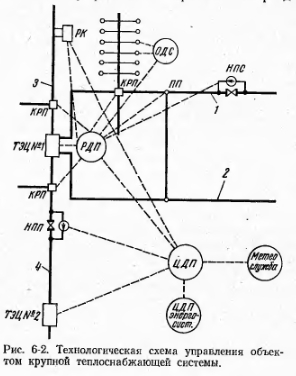ТЕХНИЧЕСКАЯ СТРУКТУРА ЭКСПЛУАТАЦИИТехническая структура современных крупных теплоснабжающих систем не может обеспечить высокой эффективности работы. Для решения этой задачи вновь сооружаемые системы должны конструироваться и работать на тех новых принципах, основы которых были изложены в гл. 4 и 5. Работающие системы должны быть подвергнуты реконструкции, которая постепенно приведет их к нужному состоянию. Очень важно, чтобы сооружение новых и реконструкция существующих систем проводились по единому хорошо продуманному плану и были зафиксированы в утвержденных положениях, нормах и других руководящих документах. Особенно тщательно должны быть продуманы схема управления системой, иерархическая структура системы, контроль, сигнализация и управление. Крупная система не может управляться без хорошо организованной информации о результатах работы, о неполадках, об отклонениях от нормы и пр. Для всего этого система должна иметь хорошую надежную связь. Объем информации, с одной стороны, должен быть достаточным для принятия решений, с другой, не должен излишне перегружать звенья управления, принимающие эти решения. Следует иметь в виду, что та техническая структура, которая может обеспечить высокую эффективность, принципиально должна иметь значительно больший объем информации, чем это имеет место и нужно в современных системах. Современные системы работают или стремятся работать на постоянном гидравлическом режиме с небольшими колебаниями по часам суток; магистральные сети и КРП в новых системах будут работать в переменном режиме. Исходя из этого, в крупных системах необходимо ориентироваться на двухступенчатую структуру диспетчерского управления: Центральный диспетчерский пункт — Районный диспетчерский пункт. На рис. 6-2 показана принципиальная схема диспетчерского управления одним объектом крупной теплоснабжающей системы. В объект входит ТЭЦ № 1 с отходящими от нее четырьмя тепловыми магистралями: магистрали № I и 2 взаимно резервируют друг друга, магистраль № 3 резервируется районной котельной (РК), а магистраль № 4 — от сетей ТЭЦ № 2; остальные тепловые сети ТЭЦ № 2 на схеме не показаны. Потребители от всех магистралей присоединяются через КРП, магистрали № 1 и 2 соединены перемычками, для чего предусмотрены переключательные пункты (ПП). На магистрали № 1 показана насосно-перекачиваю- щая станция (НПС) на подающей трубе. На магистрали № 4, соединяющей две ТЭЦ в месте установки разделительных задвижек, показан насосно-подпиточный пункт (НПП). В зависимости от местных условий ТЭЦ № 1 и 2 могут работать и параллельно и раздельно. ![]() При параллельной работе подпитка может подаваться либо с обеих ТЭЦ, либо с одной, т. е. в любой комбинации, что весьма целесообразно по соображениям ремонта и вообще повышения надежности. Такая же необходимость часто возникает и при раздельной работе ТЭЦ, эту возможность и обеспечивает НПП. Контроль за работой и состоянием оборудования в установках потребителей в предлагаемой схеме предусмотрен через объединенные диспетчерские пункты (ОДС), подчиненные жилищным организациям. ОДС выполняют эти функции наряду с диспетчированием работы лифтов, наружного освещения, водопровода и пр. Если учесть, что на рис. 6-2 показан лишь один объект (сети от одной ТЭЦ), а таких объектов в крупной системе 